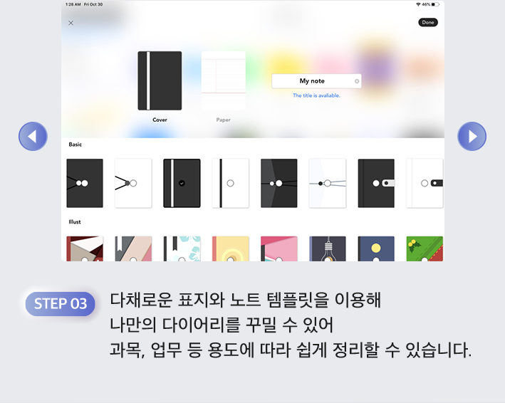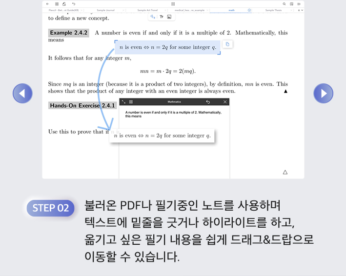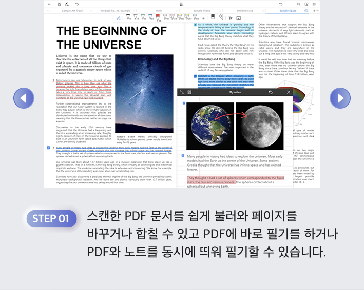 Adobe Scan 앱으로 필요한 자료를 스캔하고 플렉슬 앱으로 수업과 회의에서 자유롭게 필기해요.