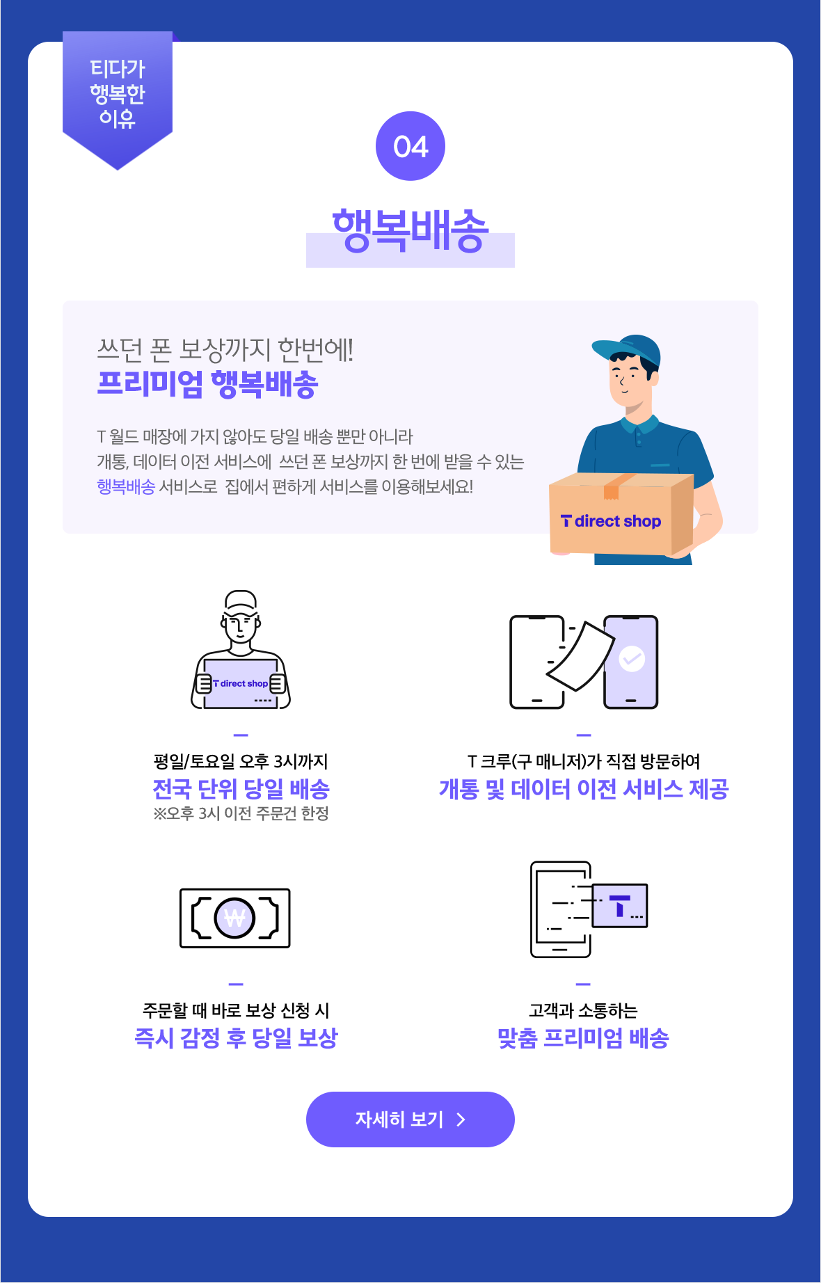 T 월드 매장에 가지 않아도 당일 배송 뿐만 아니라 개통, 데이터 이전 서비스에 쓰돈 폰 보상까지 한 번에 받을 수 있는 행복배송 서비스로 집에서 편하게 서비스를 이용해보세요!