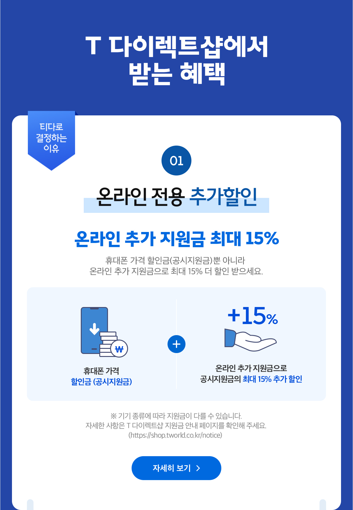 휴대폰 가격 할인금(공시지원금)뿐 아니라 온라인 추가 지원금으로 최대 15% 더 할인 받으세요.