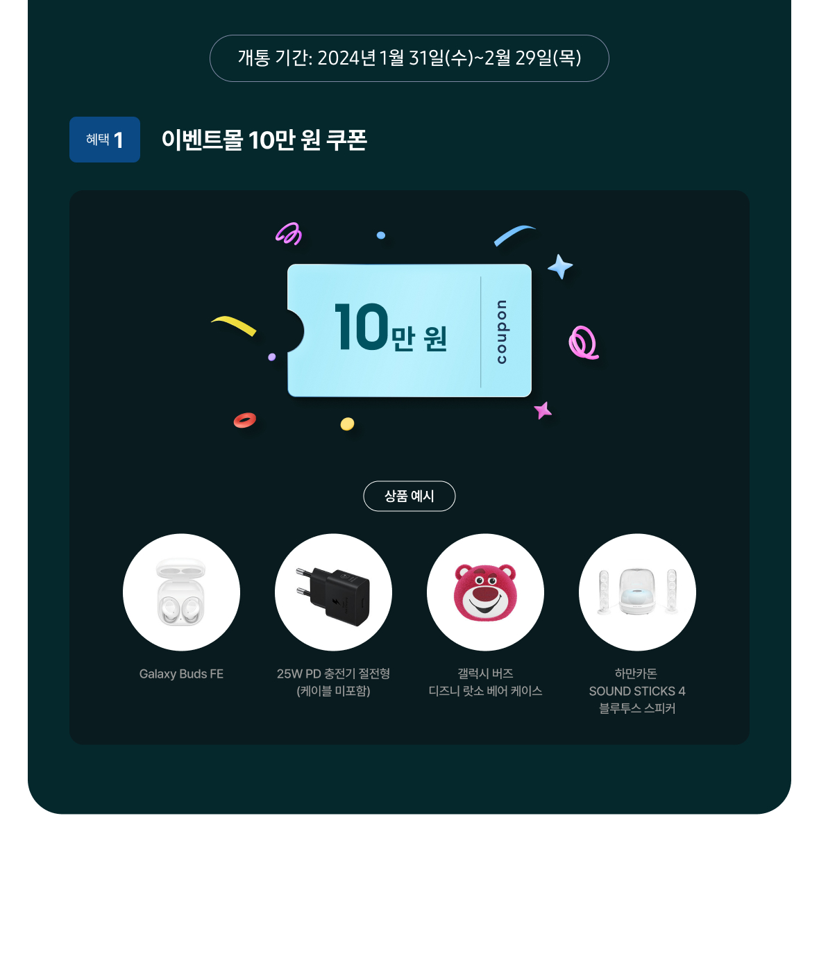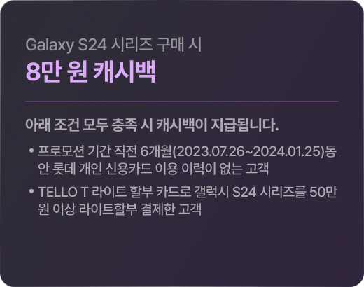 * 2024년 1월 31일(수)~2월 29일(목) 기간 내 Galaxy S24 시리즈를 개통하신 고객님(최초 통화일 기준, 사전 구매자 제외) 대상 혜택입니다.