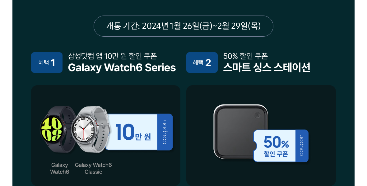 * Galaxy Watch6 Series는 삼성닷컴 혜택가 기준, 스마트 싱스 스테이션 및 Galaxy S24 Series 브랜드 콜라보 액세서리는 삼성닷컴 회원가 기준입니다.