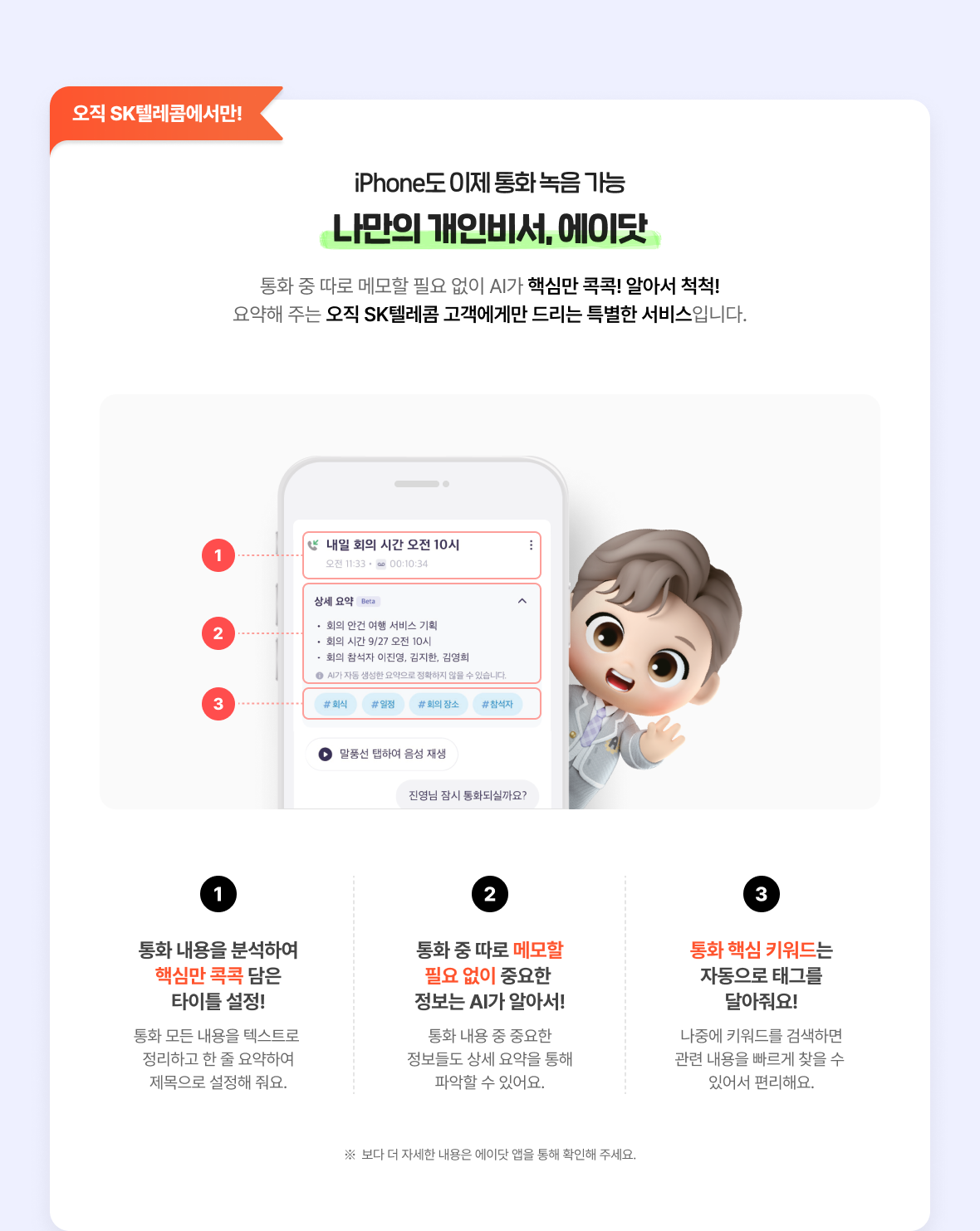 통화 중 따로 메모할 필요 없이 AI가 핵심만 콕콕! 알아서 척척! 요약해 주는 오직 SK텔레콤 고객에게만 드리는 특별한 서비스입니다.