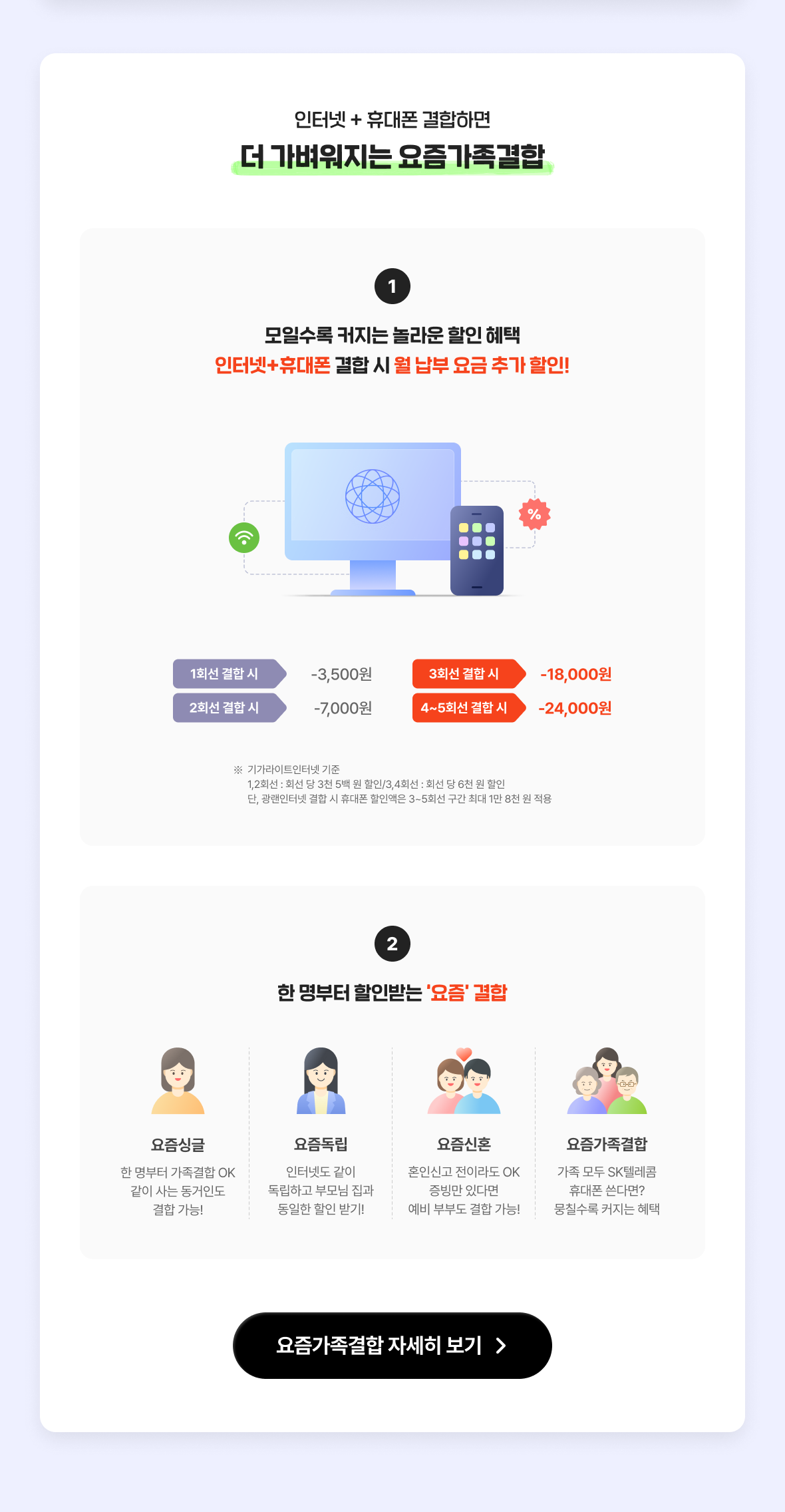 ※ 기가라이트인터넷 기준 1,2회선 : 회선 당 3천 5백 원 할인/3,4회선 : 회선 당 6천 원 할인 단, 광랜인터넷 결합 시 휴대폰 할인액은 3~5회선 구간 최대 1만 8천 원 적용