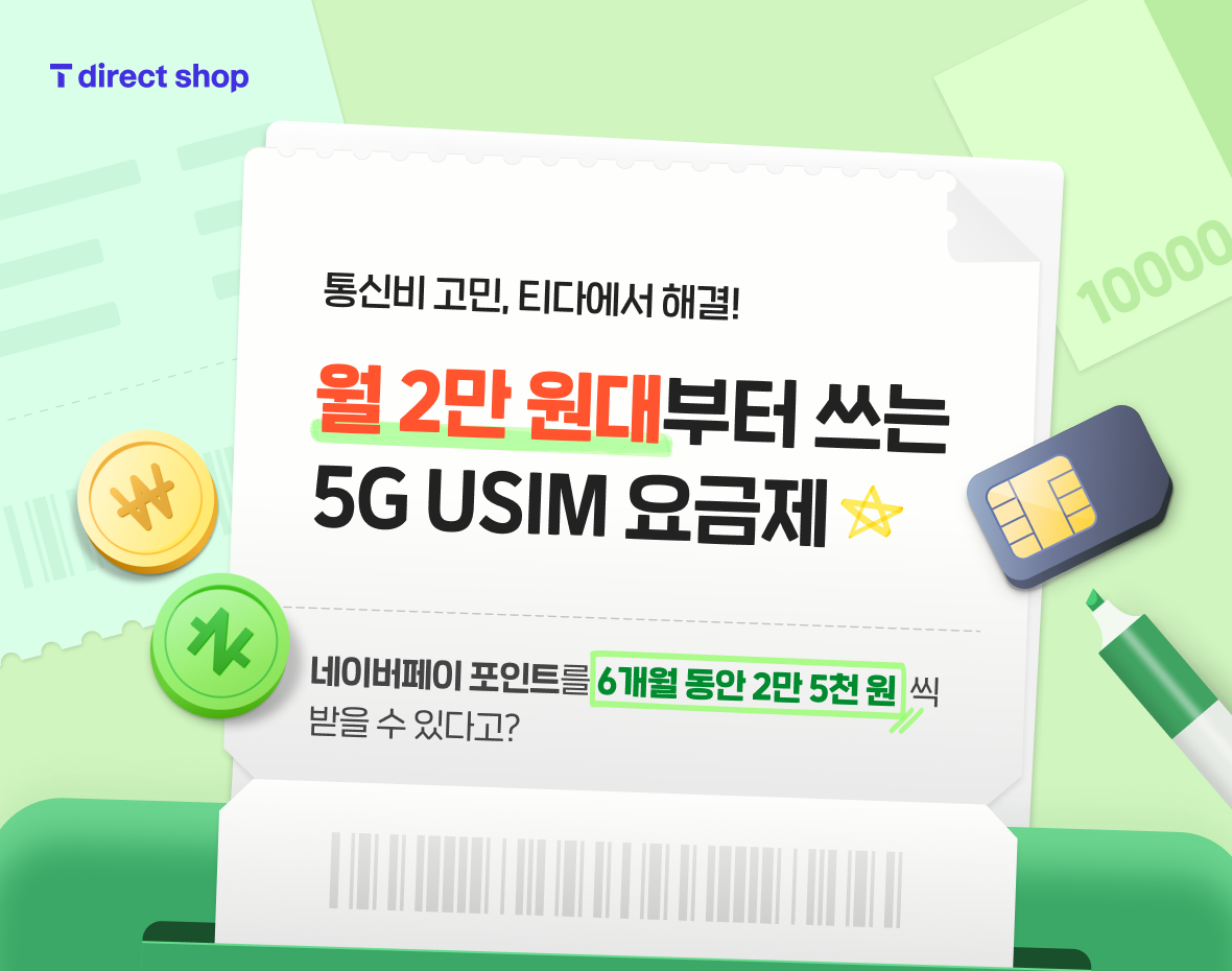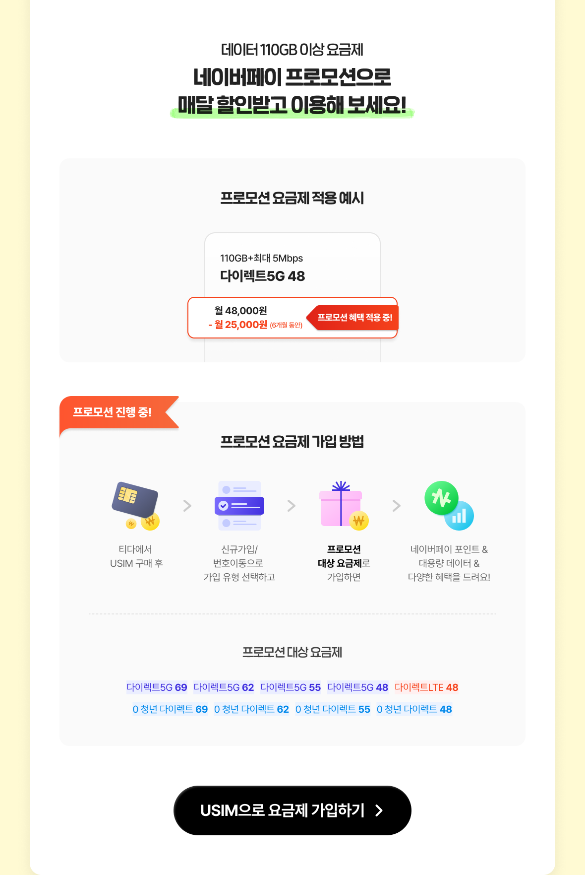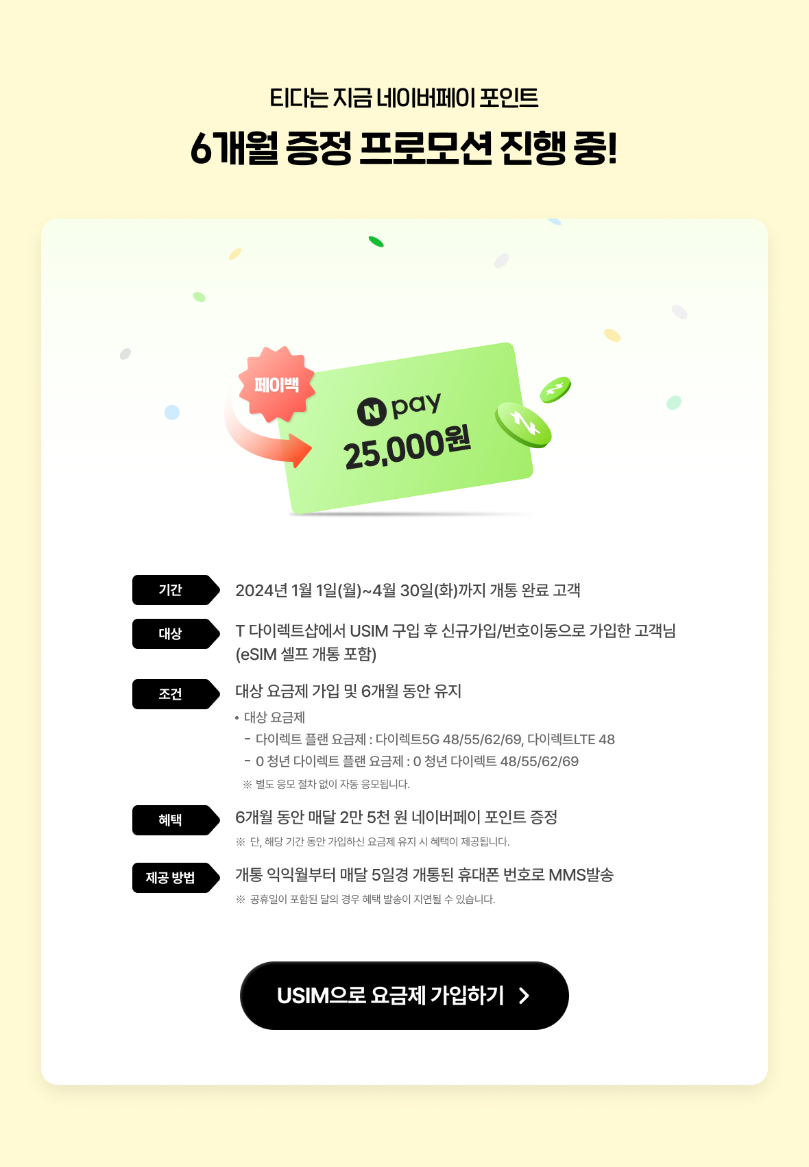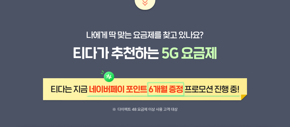 티다는 지금 네이버페이 포인트 6개월 증정 프로모션 진행 중! (※ 다이렉트 48 요금제 이상 사용 고객 대상)