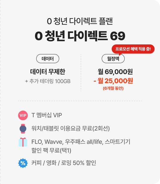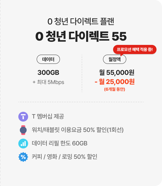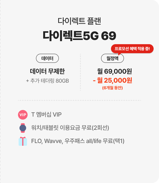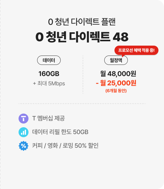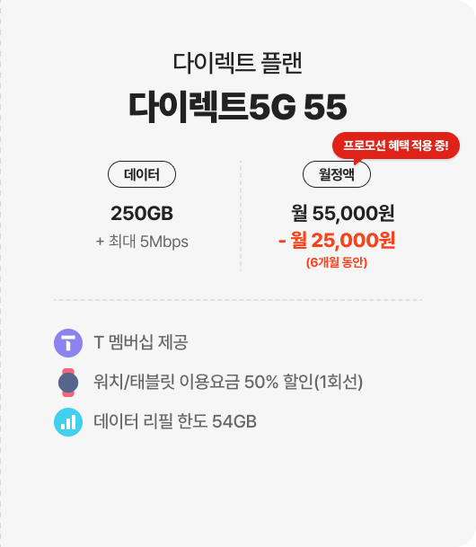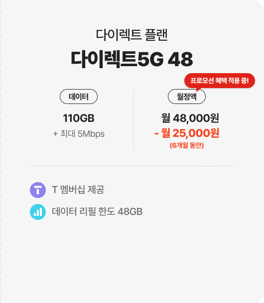 프로모션 요금제 적용 예시 110GB+최대 5Mbps 다이렉트5G 48 | 월정액 월 48,000원 - 월 25,000원 (6개월 동안) [프로모션 혜택 적용 중!]