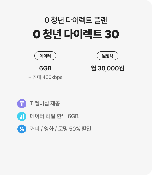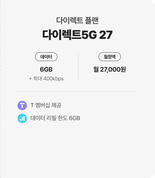 온라인 요금제 30% 할인 적용 예시(T끼리온가족할인 가족 그룹 휴대폰 총 가입 연수+인터넷 가입 연수 30년 이상 기준) 6GB+최대 400kbps | 다이렉트5G 27 | 월정액 월 27,000원 혜택가 월 18,900원 [30% 할인]
