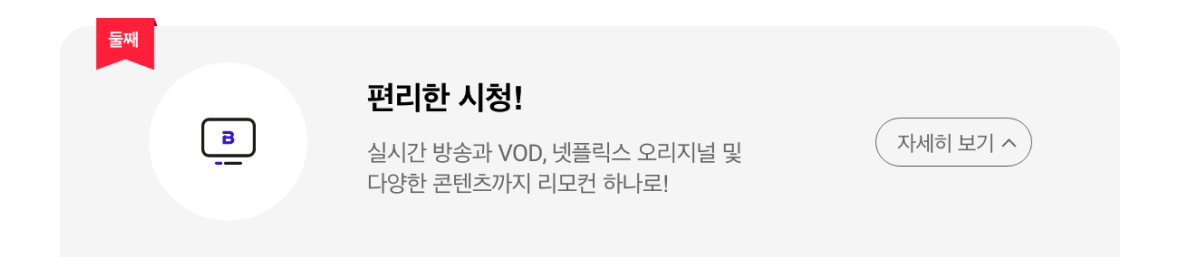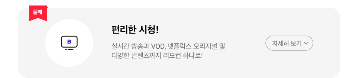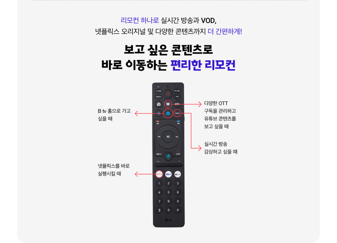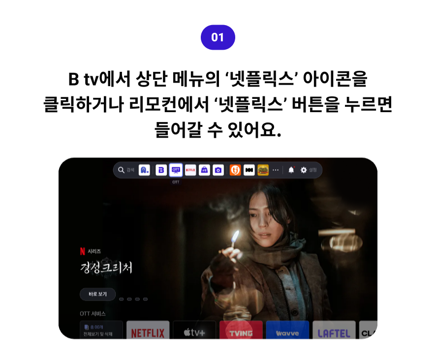 더 강력해진 콘텐츠 라이프 B tv의 실시간 방송과 넷플릭스 오리지널 및 다양한 콘텐츠를 한 번에 즐기세요!