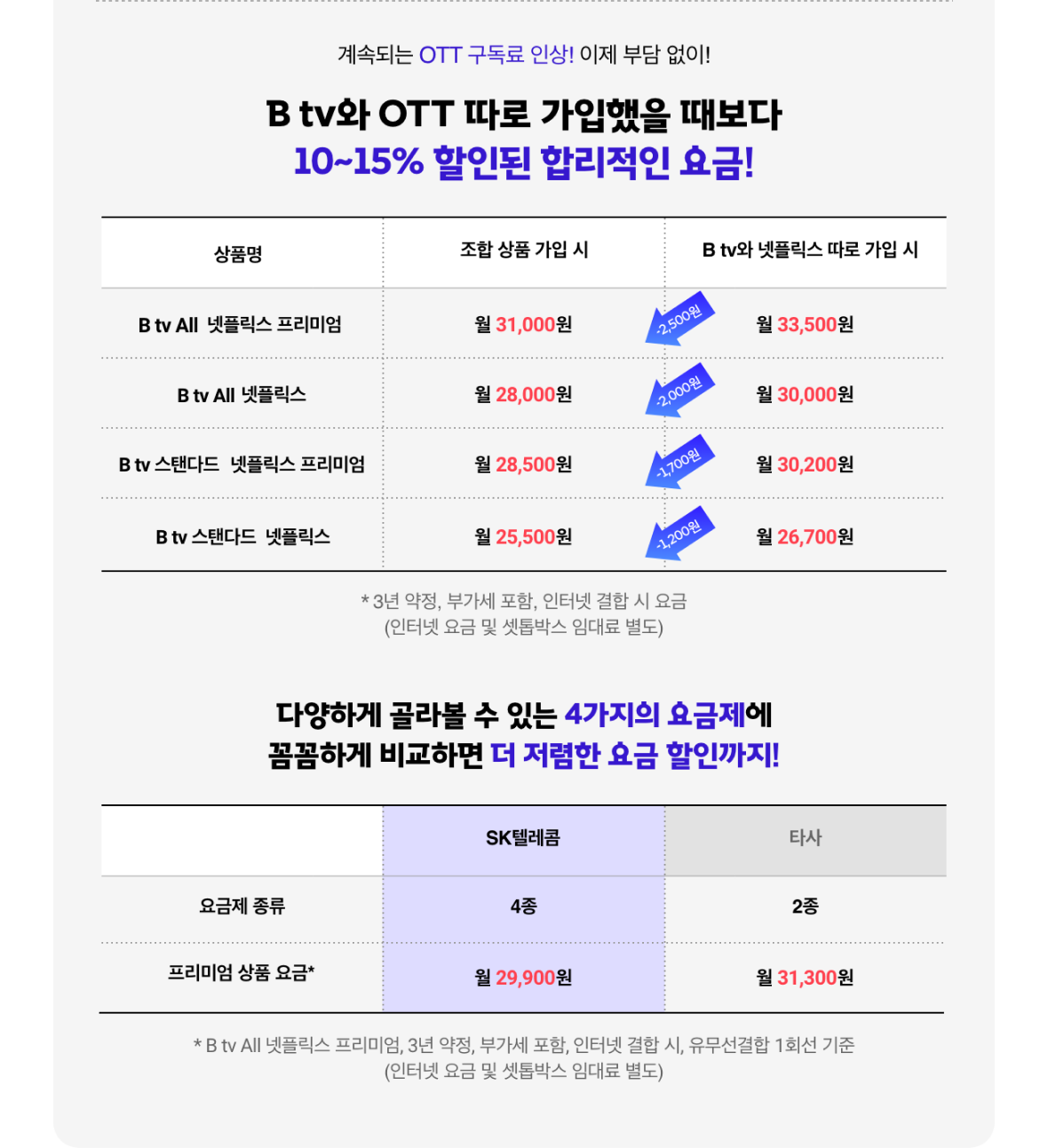 * 3년 약정, 부가세 포함, 인터넷 결합 시 요금 (인터넷 요금 및 셋톱박스 임대료 별도)