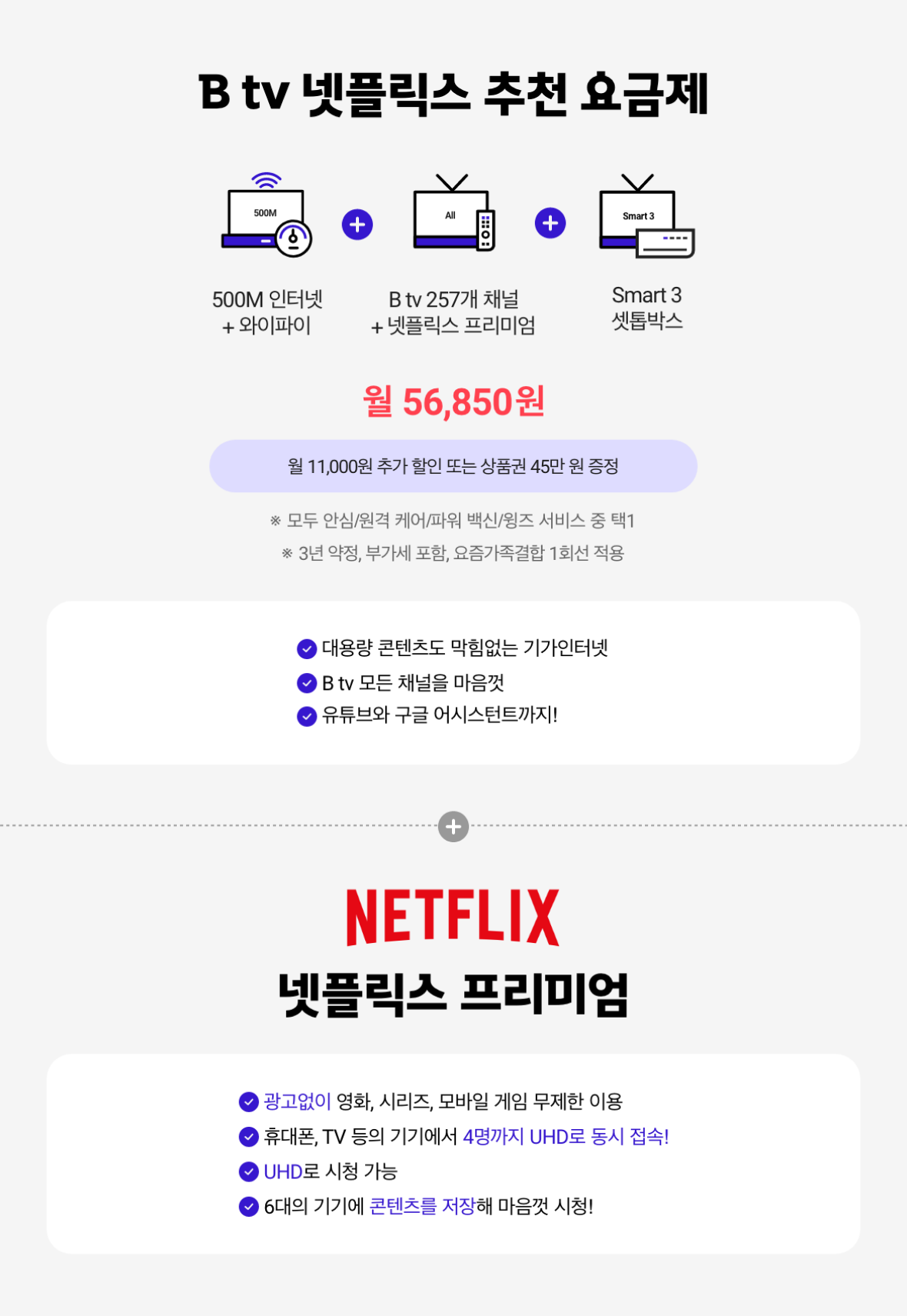 500M 인터넷+와이파이 + B tv 257개 채널+넷플릭스 프리미엄 + Smart 3 셋톱박스