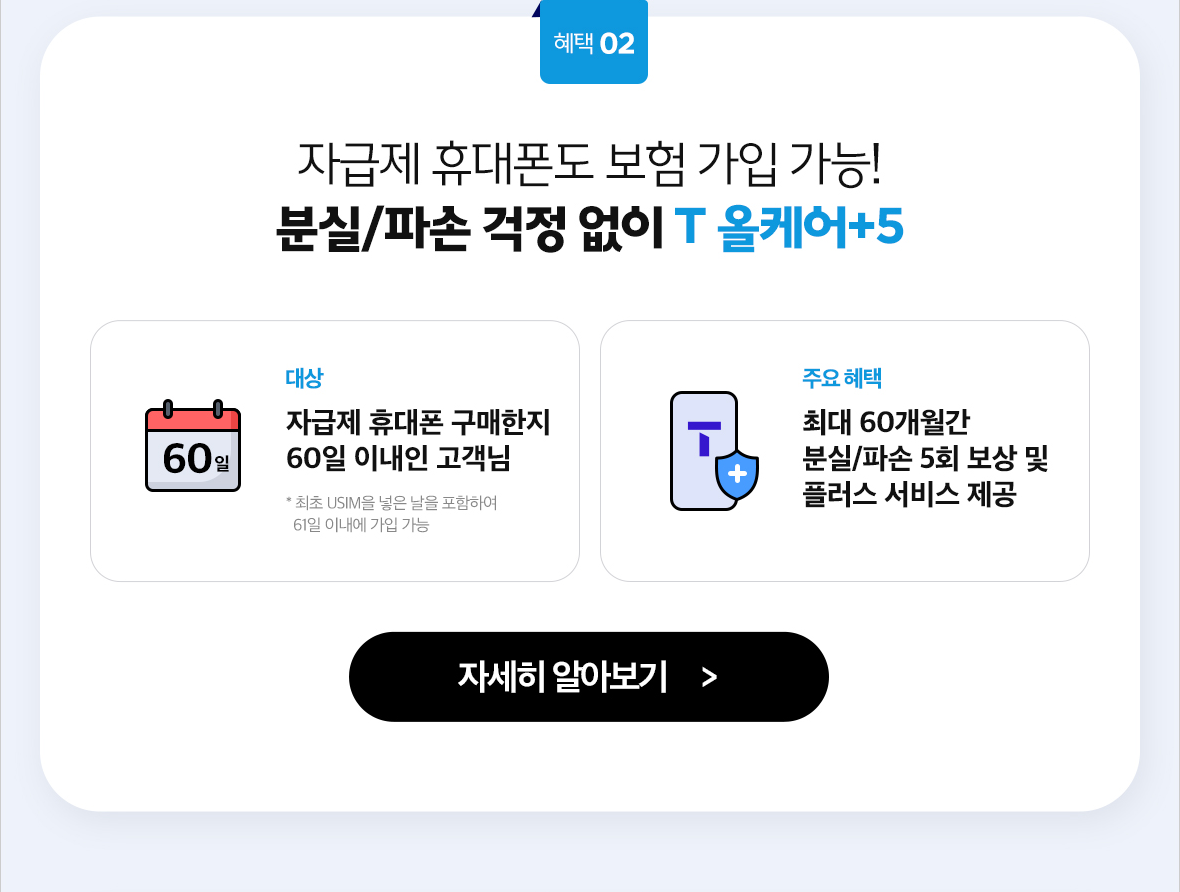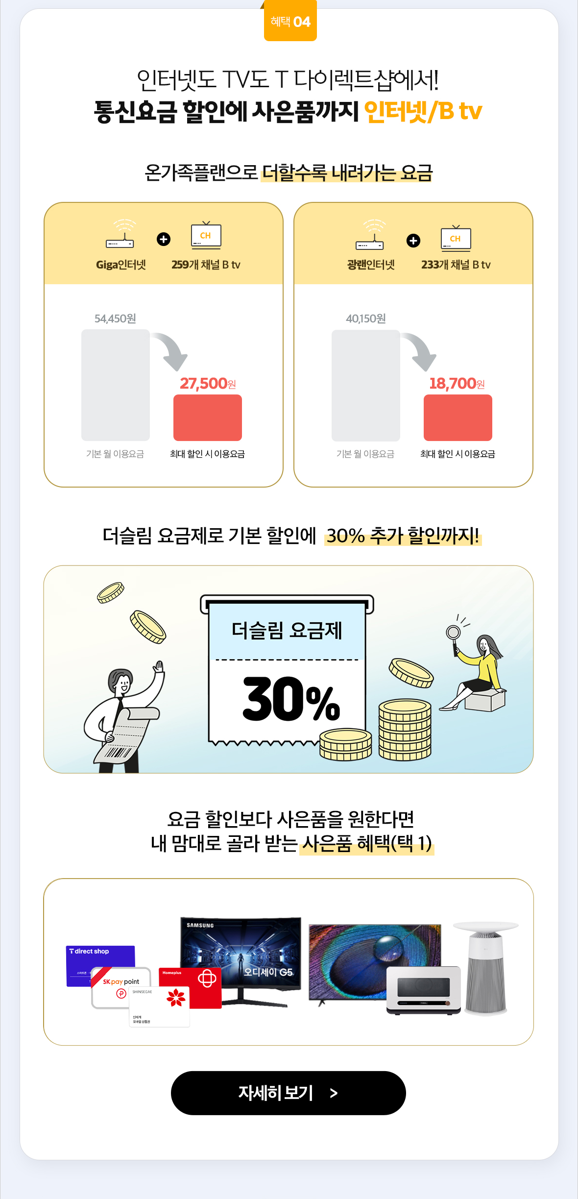 요금 할인보다 사은품을 원한다면 내 맘대로 골라 받는 사은품 혜택(택 1): T 다이렉트샵 이용권, SK pay point 상품권, 신세계 모바일 상품권, 홈플러스 모바일 상품권, 삼성 32인치 커브드 모니터, LG 울트라 HD TV, 삼성 BESPOKE 큐커, LG 퓨리케어 오브제컬렉션 에어로퍼니처 등