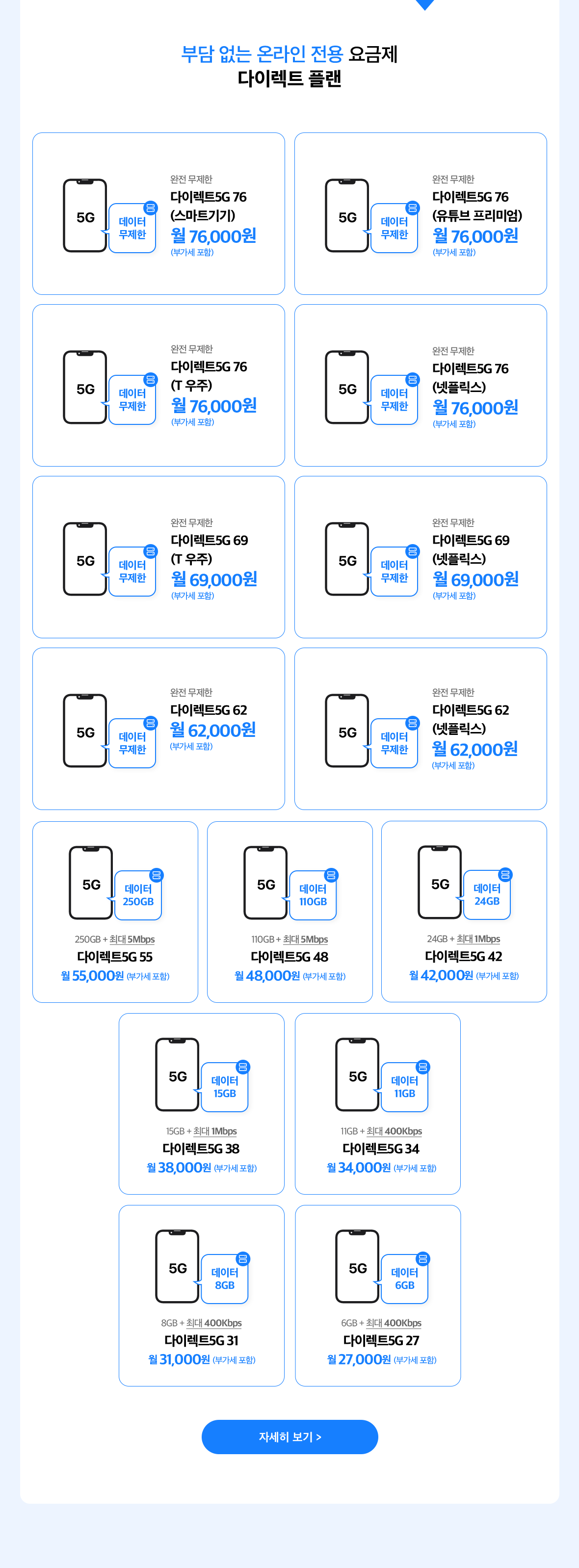 • 다이렉트5G 76(스마트기기) | 월 76,000원 (부가세 포함) | 데이터 완전 무제한