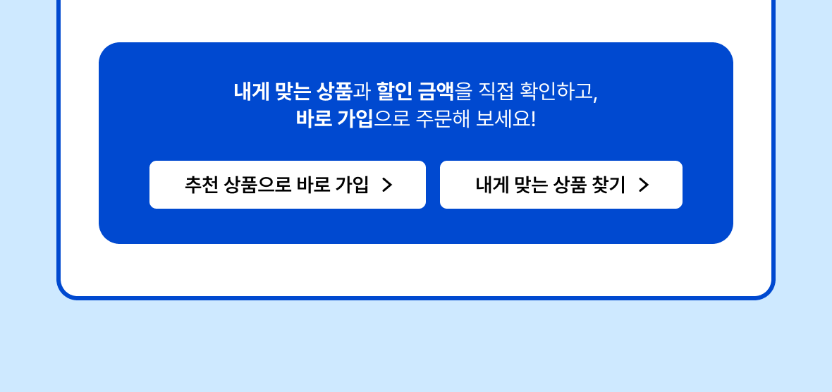 한 번 더 저렴해지는 요금 혜택! 단품/결합 상품 상관없이 요금 할인 혜택을 받으실 수 있습니다.