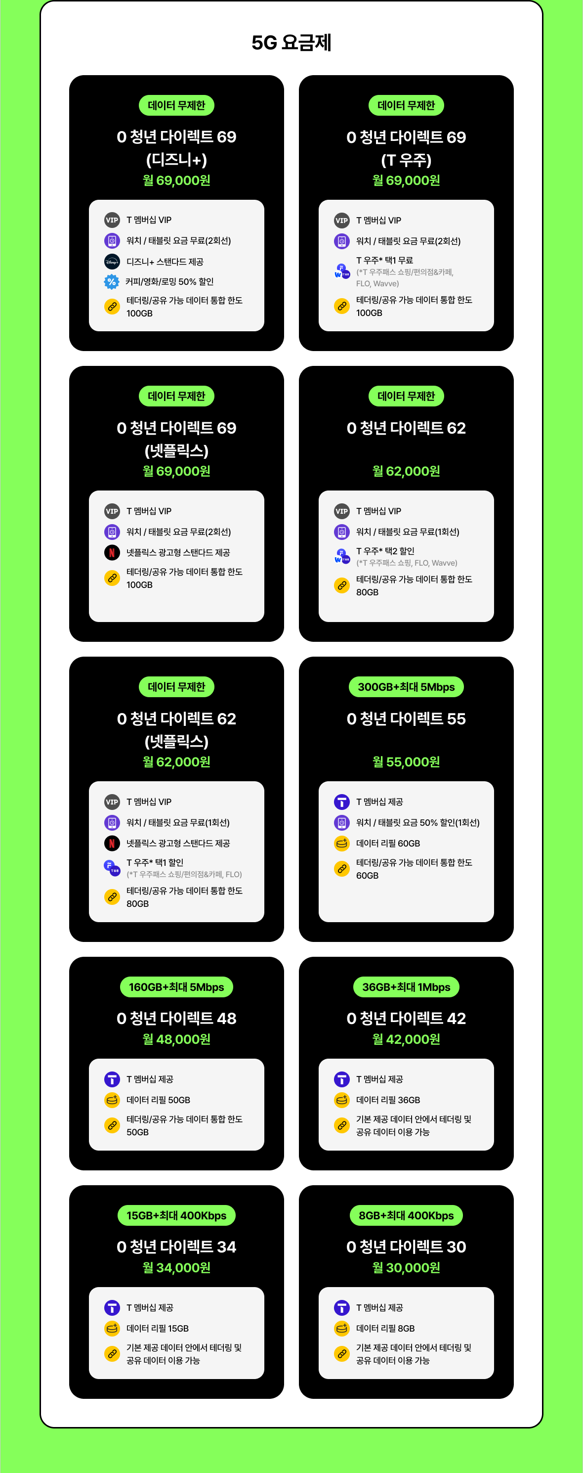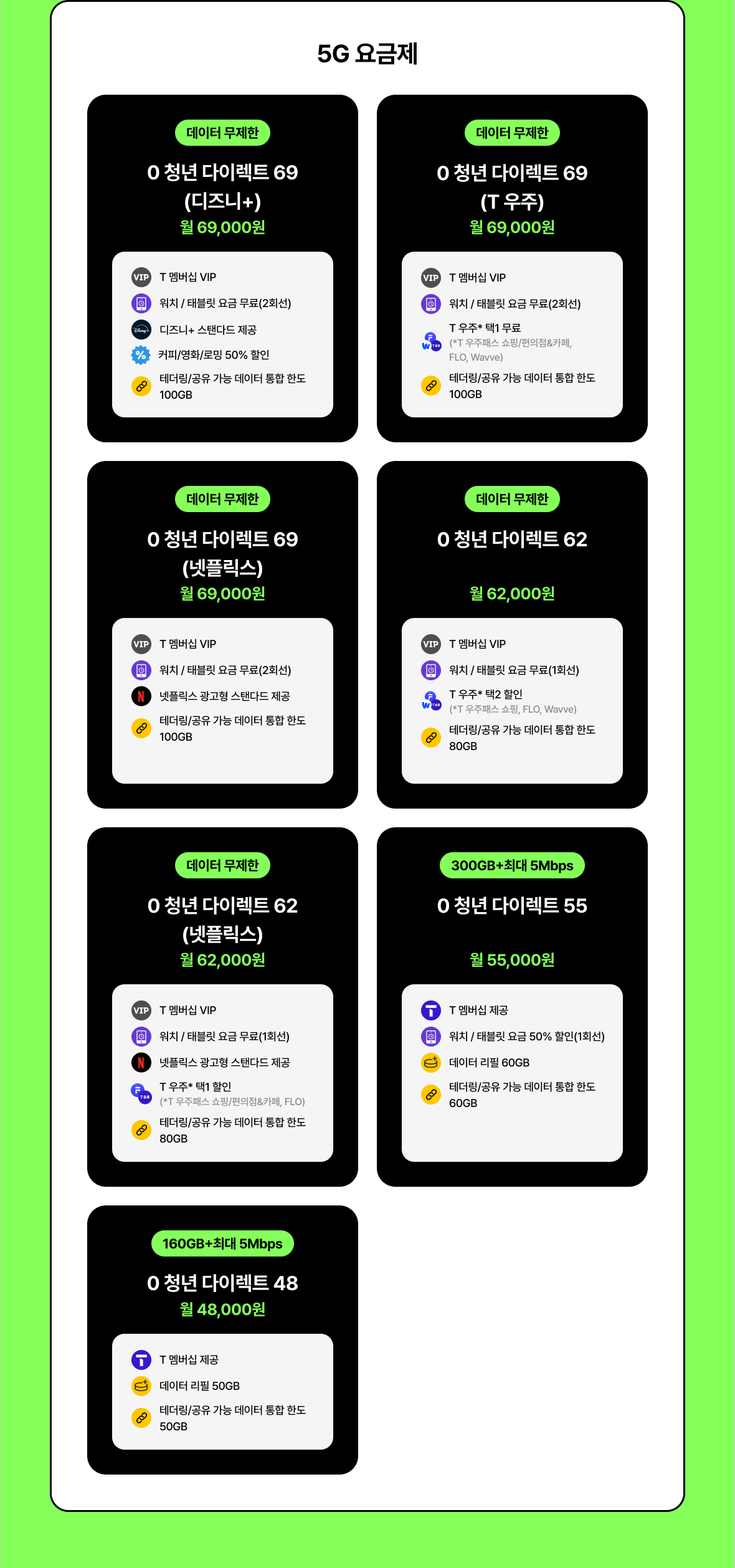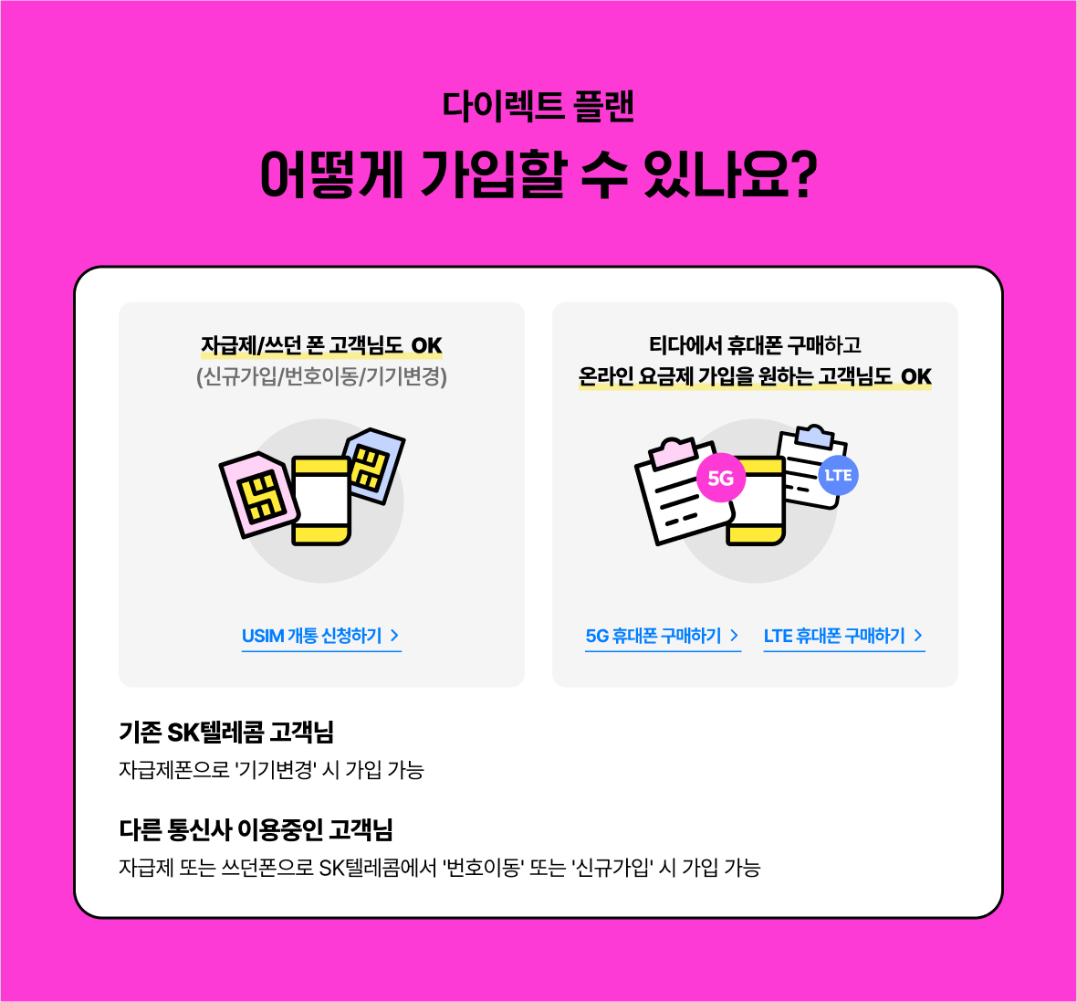 T 월드 매장에 방문하지 않아도 T 다이렉트샵에서 신규가입, 번호이동, 기기변경 시 가입할 수 있는 합리적인 요금제입니다.