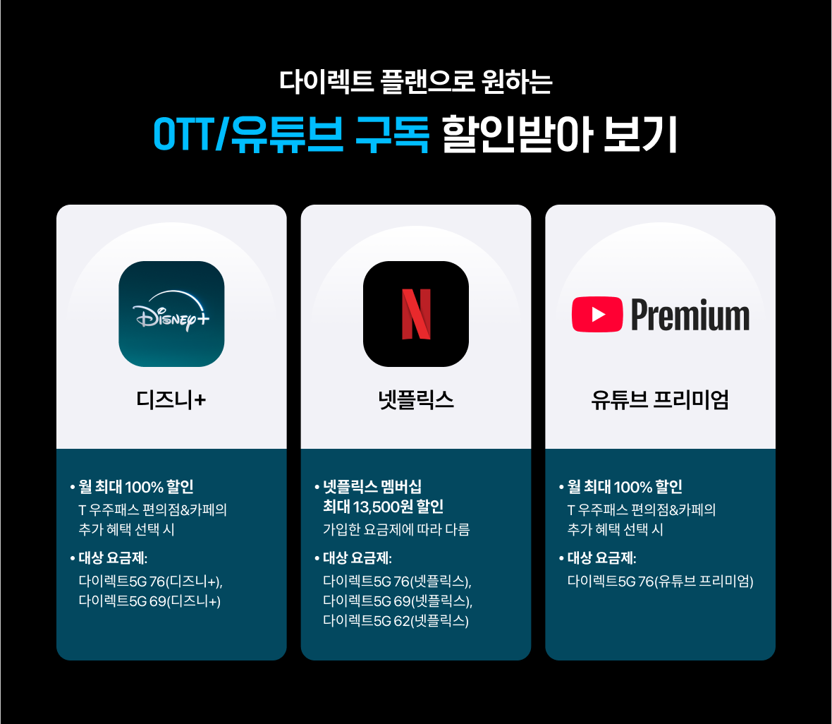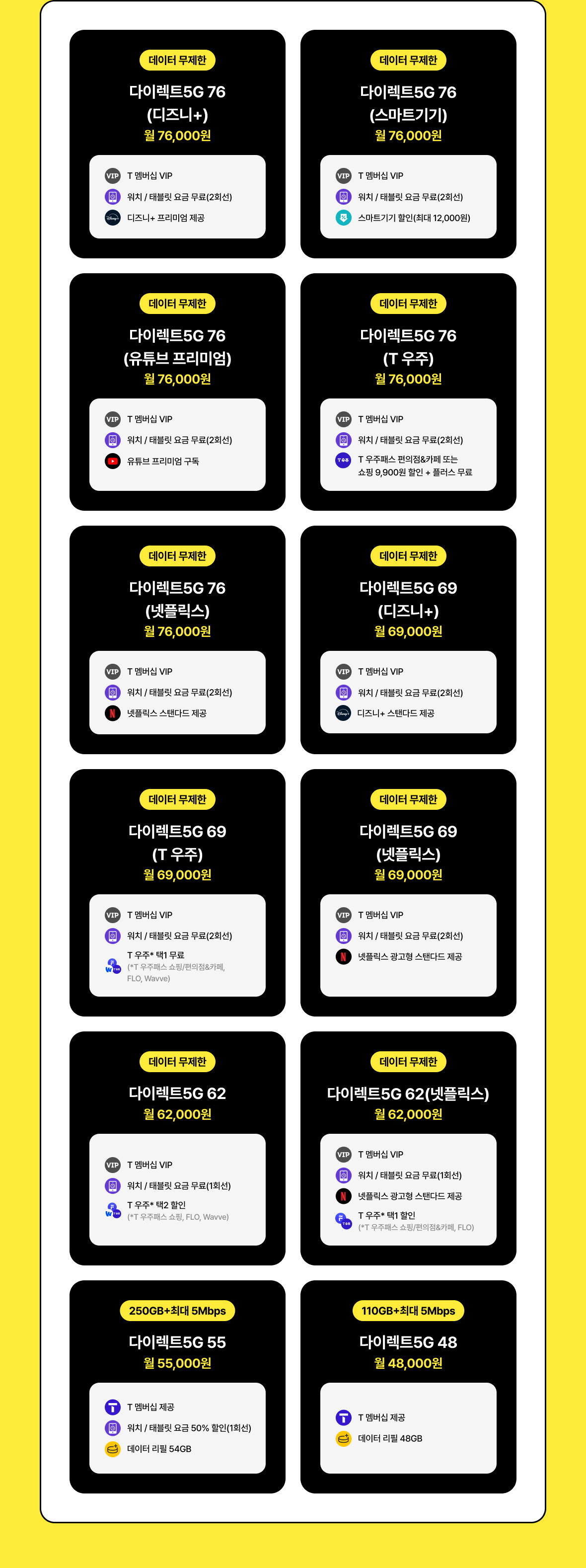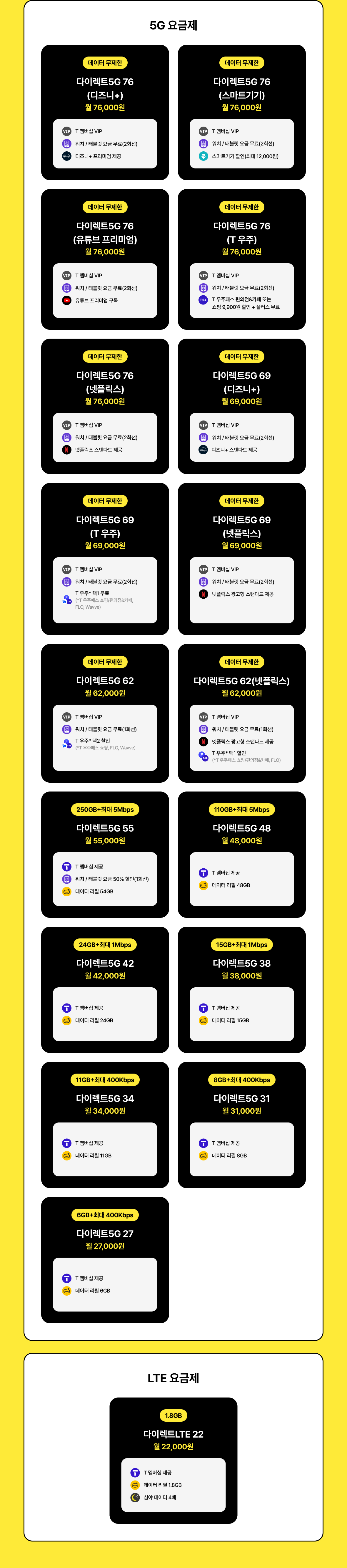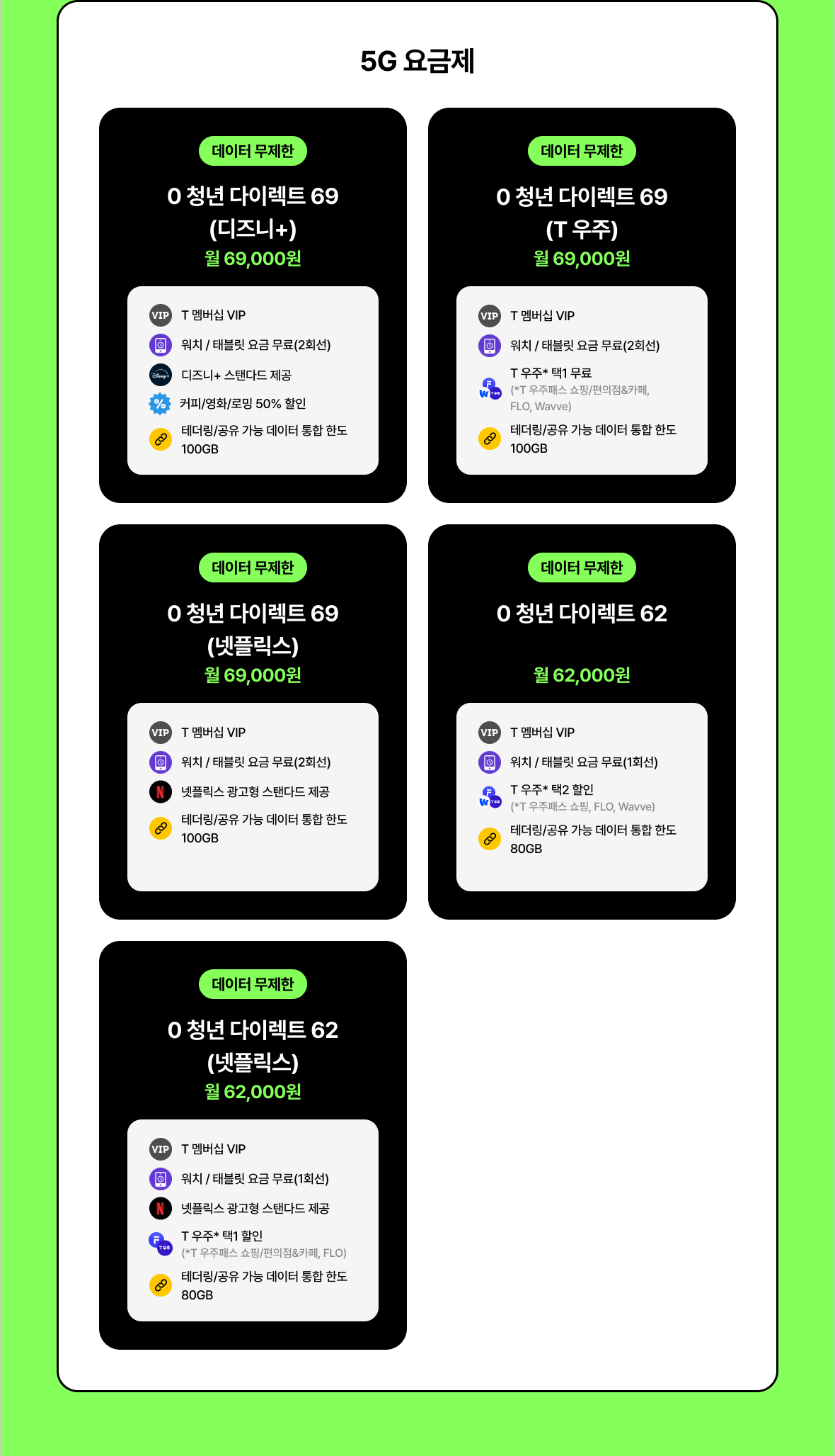 T 월드 매장에 방문하지 않아도 T 다이렉트샵에서 신규가입, 번호이동, 기기변경 시 가입할 수 있는 합리적인 요금제입니다.