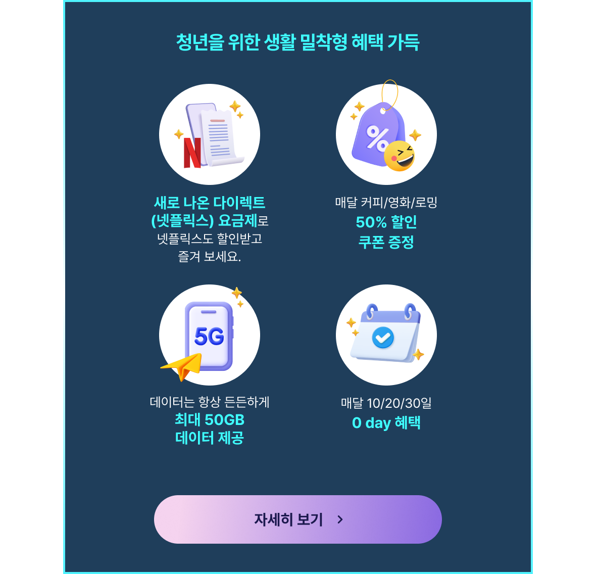 - 0 청년 다이렉트 플랜은 5G 스마트폰을 사용하는 만 34세 이하 고객님만 가입하실 수 있습니다.