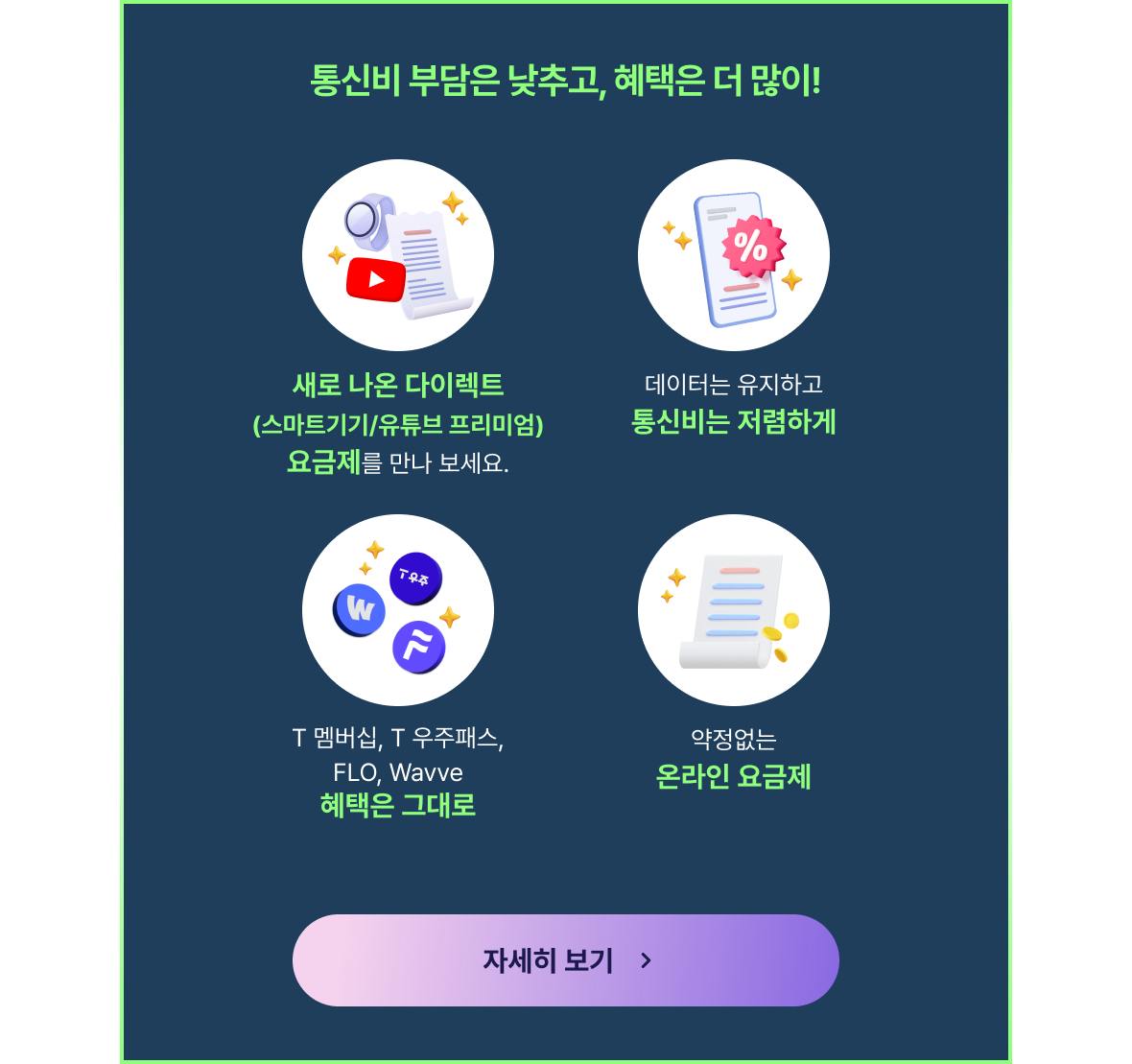 - 새로 나온 다이렉트(스마트기기/유튜브 프리미엄) 요금제를 만나 보세요.
