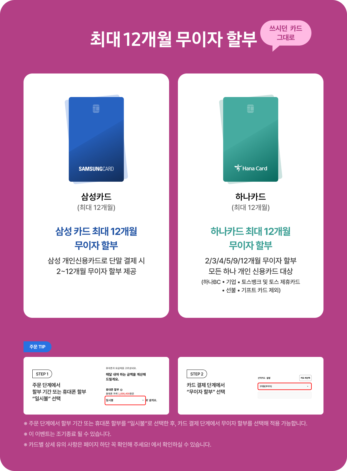 삼성 개인신용카드로 단말 결제 시 2~12개월 무이자 할부 제공
