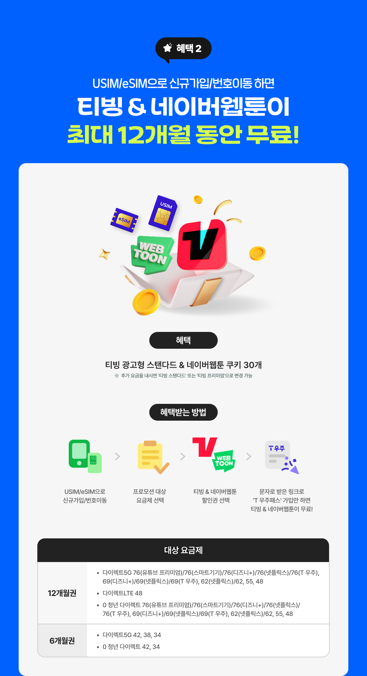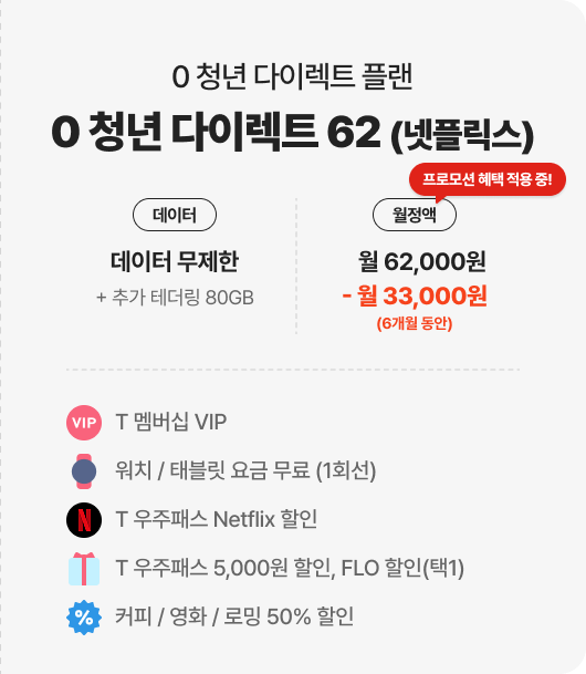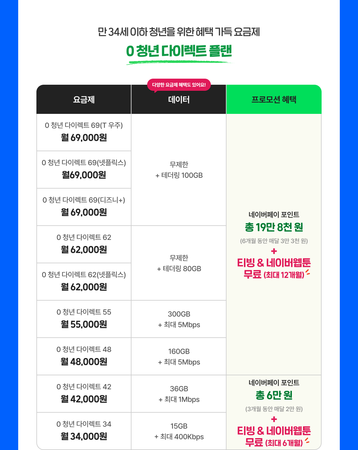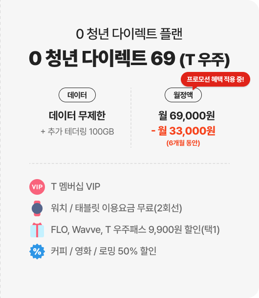 | 0 청년 다이렉트 69(T 우주) 월 69,000원 | 무제한 + 테더링 100GB | 네이버페이 포인트 총 19만 8천 원(6개월 동안 매달 3만 3천 원) + 티빙 & 네이버웹툰 무료 (최대 12개월) |