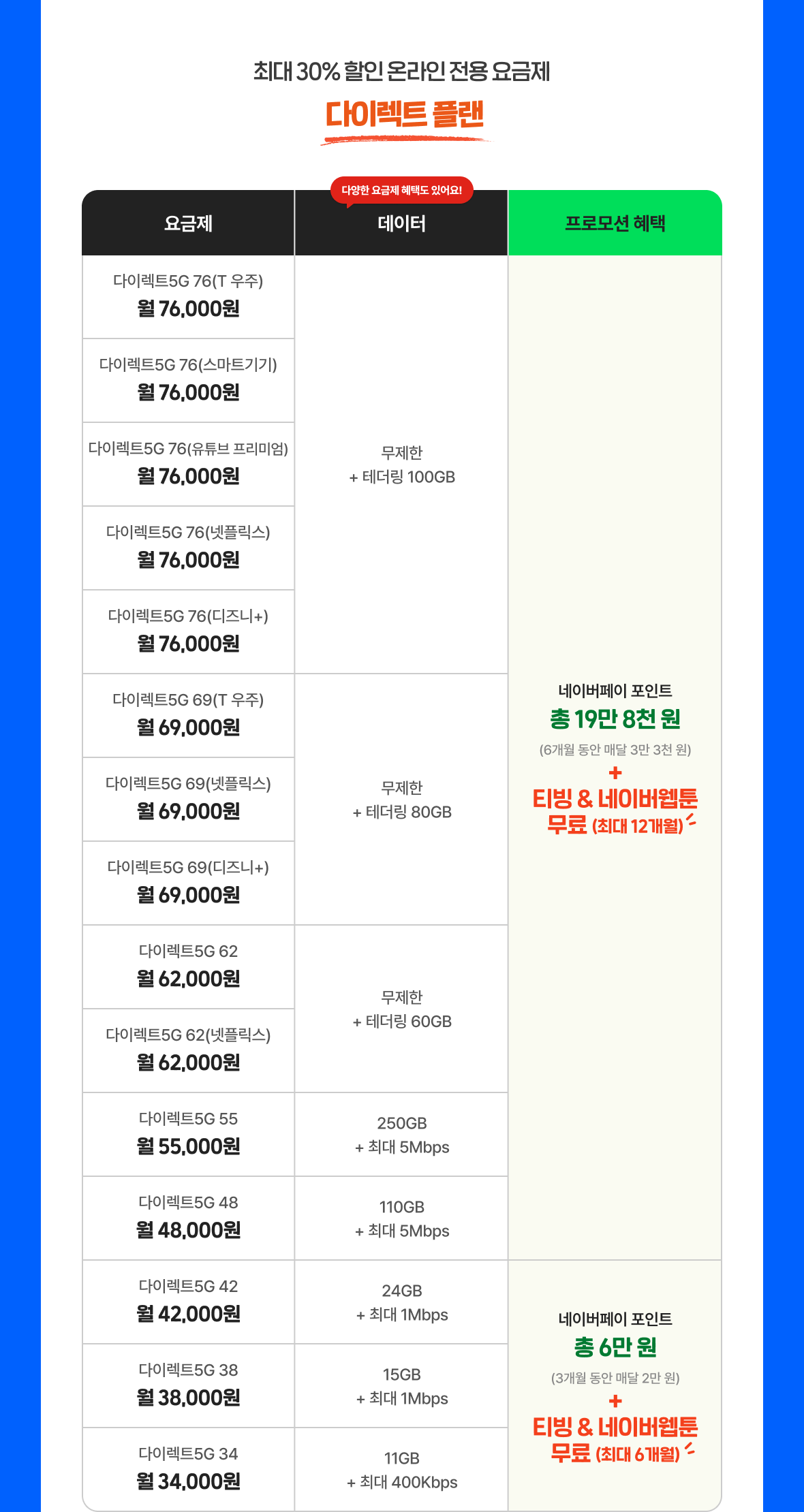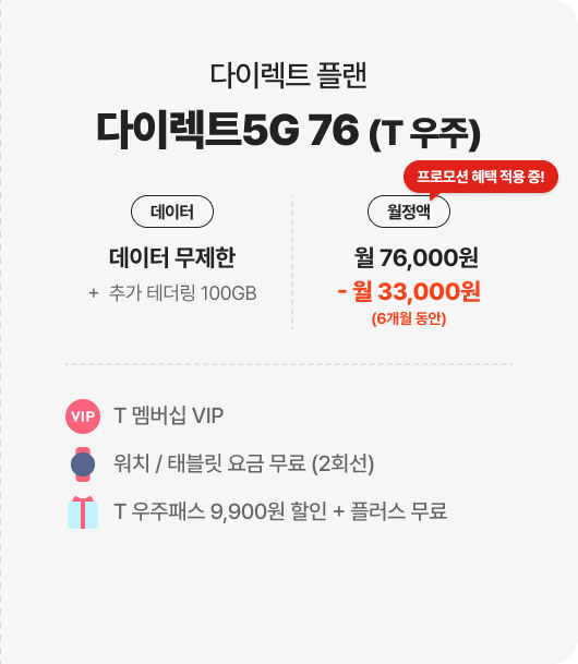 | 다이렉트5G 76(T 우주) 월 76,000원 | 무제한 + 테더링 100GB | 네이버페이 포인트 총 19만 8천 원(6개월 동안 매달 3만 3천 원) + 티빙 & 네이버웹툰 무료 (최대 12개월) |