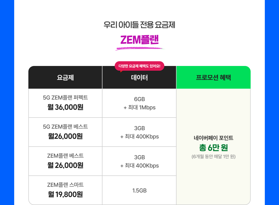 | 5G ZEM플랜 퍼펙트 월 36,000원 | 6GB + 최대 1Mbps | 네이버페이 포인트 총 6만 원 (6개월 동안 매달 1만 원) |
