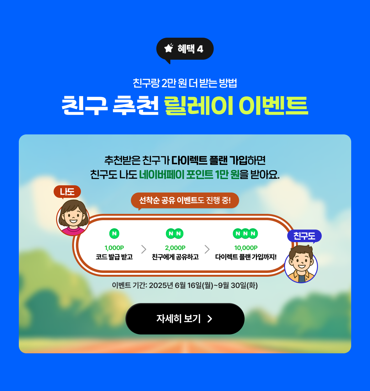 추천받은 친구가 다이렉트 플랜 가입하면 친구도 나도 네이버페이 포인트 1만 원을 받아요.