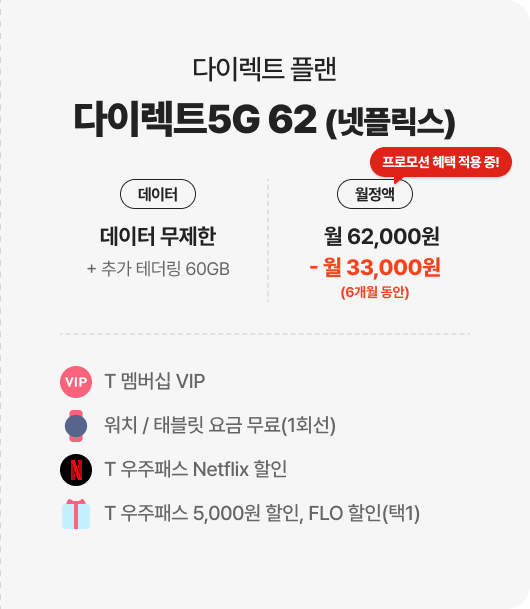 | 다이렉트5G 62 (넷플릭스) 월 62,000원 | ||