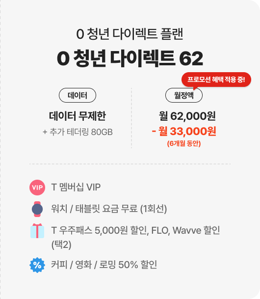 | 0 청년 다이렉트 62 월 62,000원 | 무제한 + 테더링 80GB | |