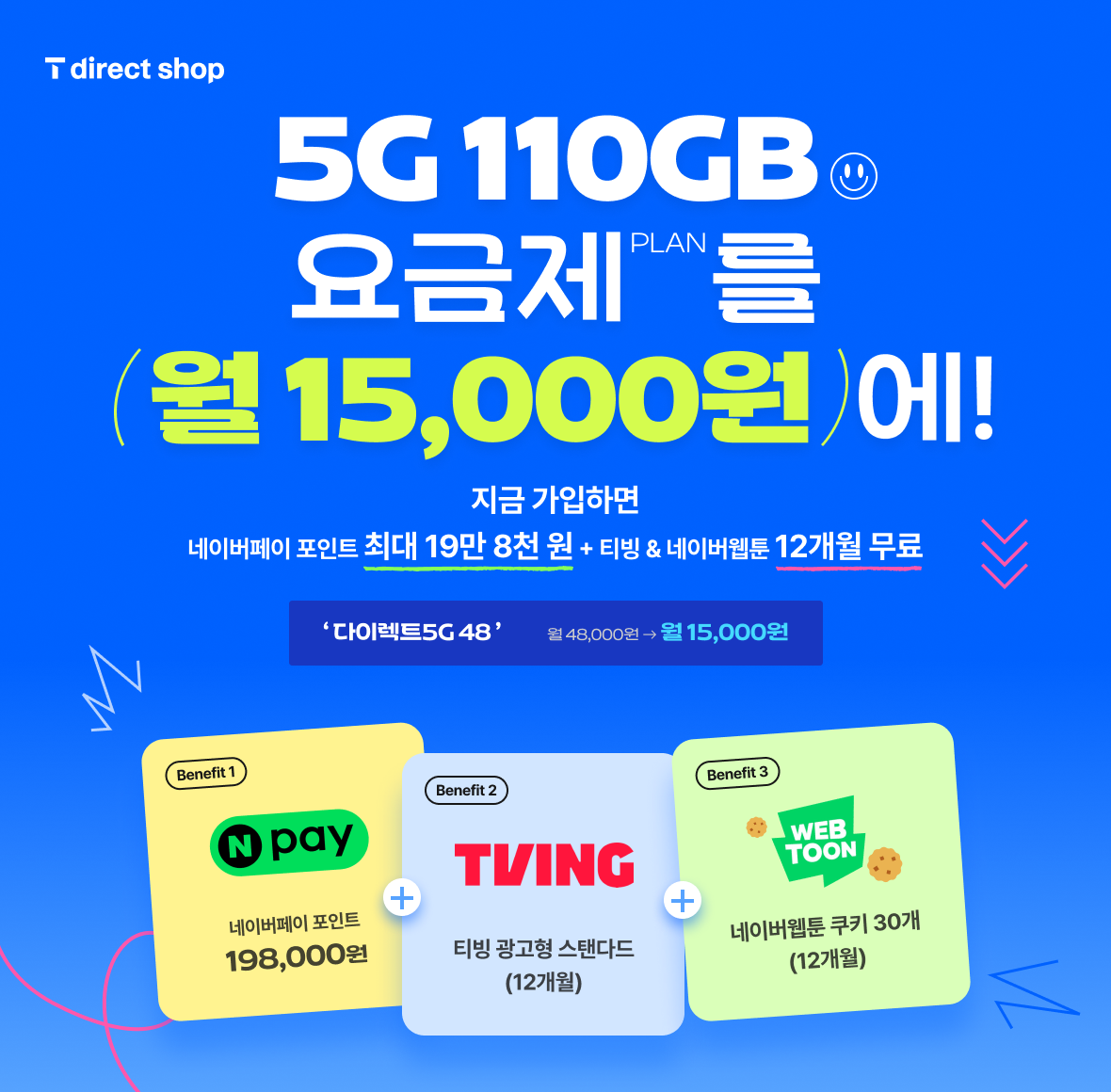 | 다이렉트5G 42 월 42,000원 | 24GB + 최대 1Mbps | 네이버페이 포인트 총 6만 원 (3개월 동안 매달 2만 원) + 티빙 & 네이버웹툰 무료 (최대 6개월) |