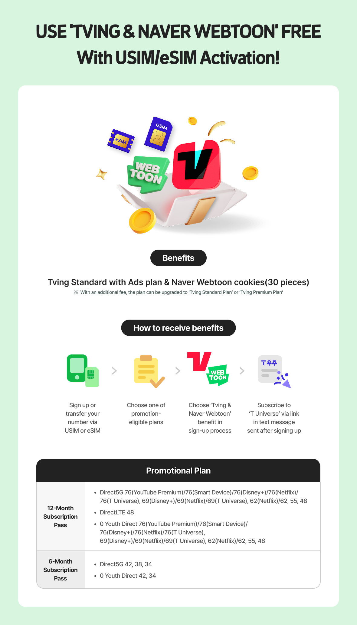| 12-Month Subscription Pass | - Direct5G 76(YouTube Premium)/76(Smart Device)/76(Disney+)/76(Netflix)/76(T Universe), 69(Disney+)/69(Netflix)/69(T Universe), 62(Netflix)/62, 55, 48 - DirectLTE 48 - 0 Youth Direct 76(YouTube Premium)/76(Smart Device)/76(Disney+)/76(Netflix)/76(T Universe),69(Disney+)/69(Netflix)/69(T Universe), 62(Netflix)/62, 55, 48 |