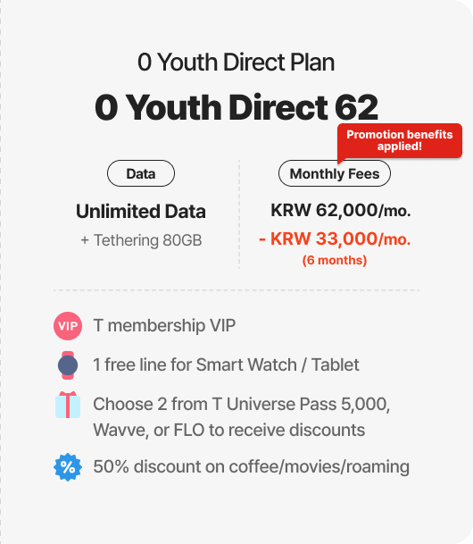Example of 30% discount for online plan(T Family Discount for Total mobile phone subscription years of family members + Internet subscription years of 30 years or more) 6GB + Max. 400kbps | Direct5G 27 | Monthly Fees KRW 27,000/mo. > KRW 18,900/mo. [30% discount]