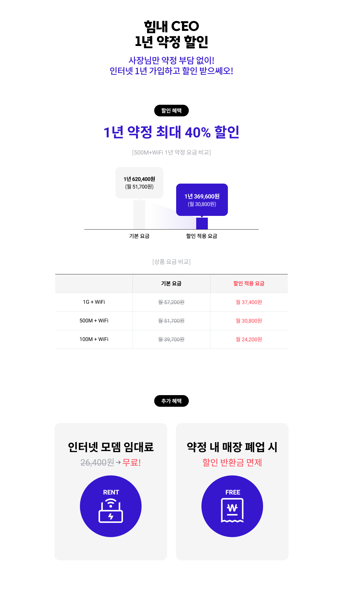 인터넷 모뎀 임대료 무료! 약정 내 매장 폐업 시 할인 반환금 면제.
