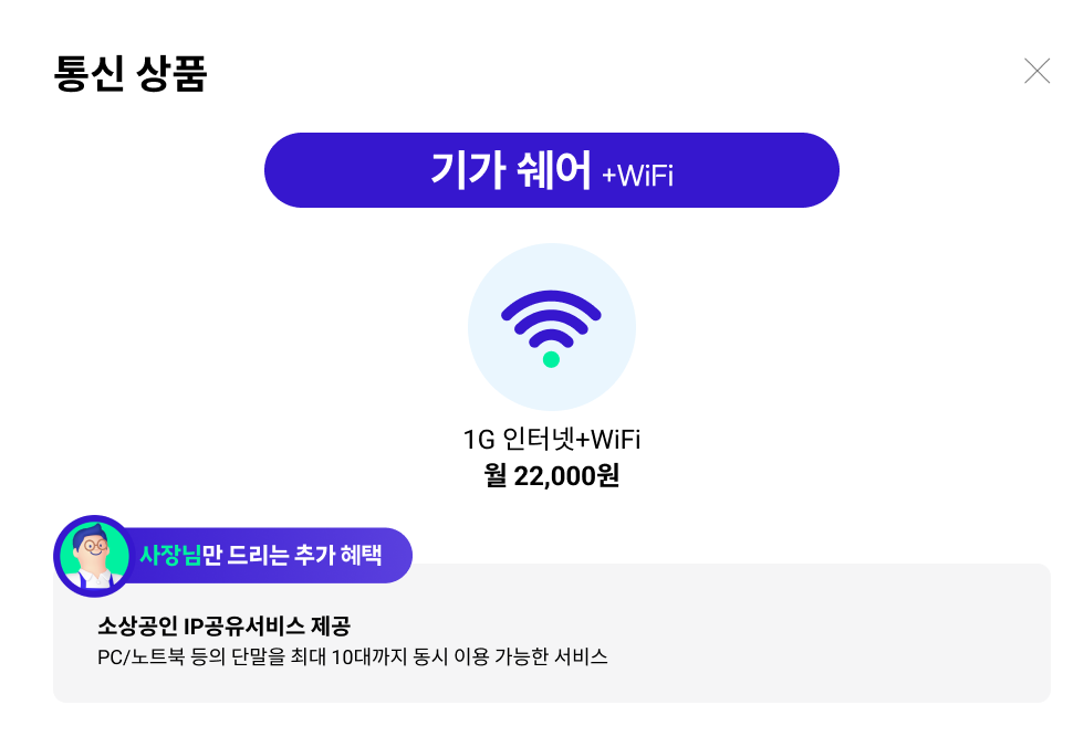 사장님만 드리는 추가 혜택: 소상공인 IP공유서비스 제공 PC/노트북 등의 단말을 최대 10대까지 동시 이용 가능한 서비스