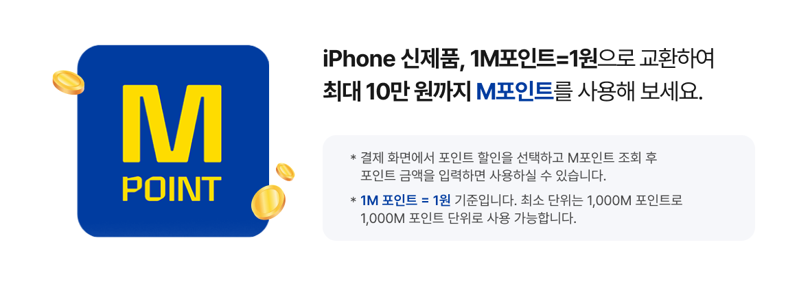 iPhone 신제품, 1M포인트=1원으로 교환하여 최대 10만 원까지 M포인트를 사용해 보세요.