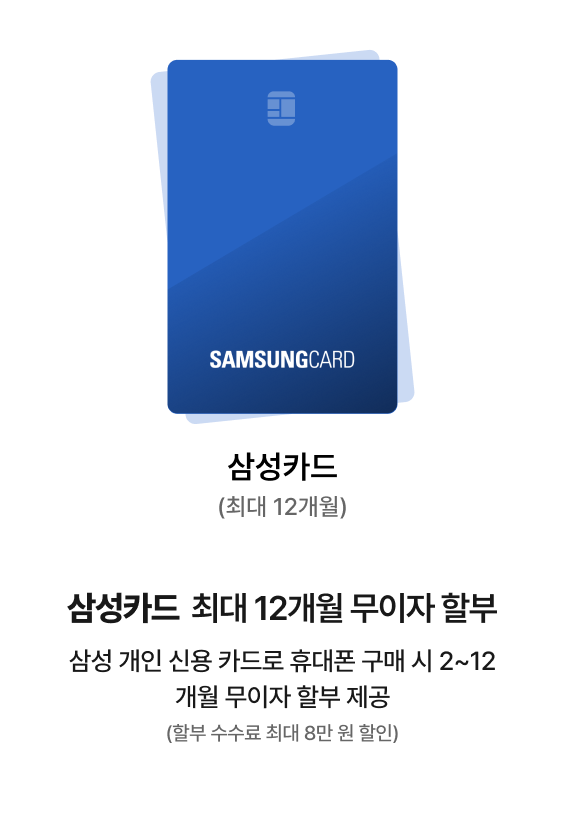 삼성 개인 신용 카드로 휴대폰 구매 시 2~12개월 무이자 할부 제공 (할부 수수료 최대 8만 원 할인)