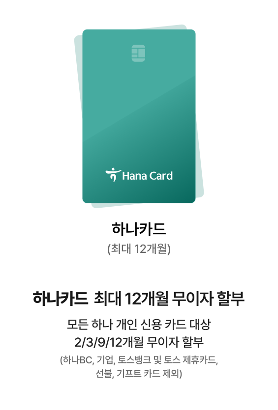 모든 하나 개인 신용 카드 대상 2/3/9/12개월 무이자 할부 (하나BC, 기업, 토스뱅크 및 토스 제휴카드, 선불, 기프트 카드 제외)