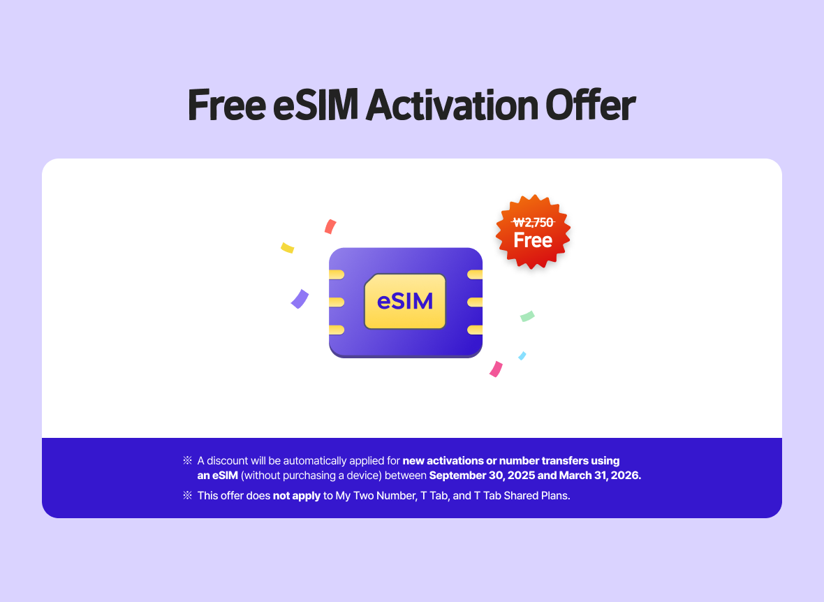 * A discount will be automatically applied for new activations or number transfers using an eSIM (without purchasing a device) between September 30, 2025 and March 31, 2026. * This offer does not apply to My Two Number, T Tab, and T Tab Shared Plans.