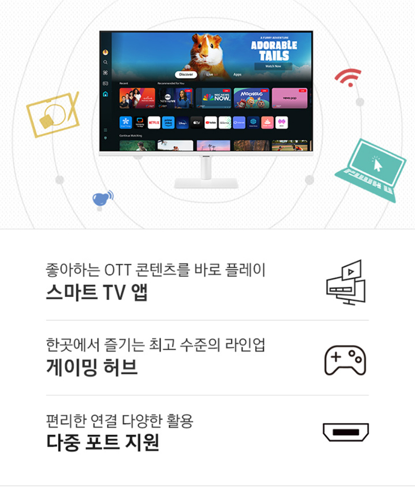 - 스마트 모니터에는 스트리밍 앱에 필요하지 않은 TV 튜너가 포함되어 있지 않습니다.