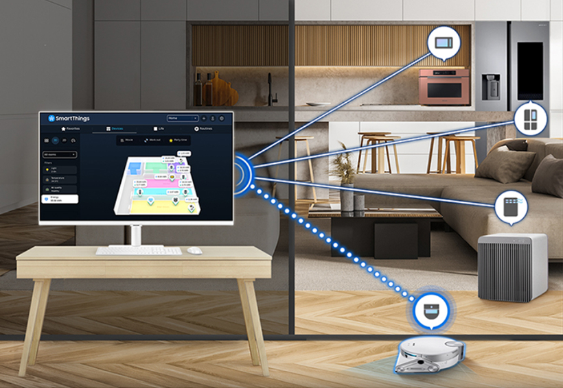 3D 지도를 통해 집 안의 스마트 홈 기기 위치를 확인하고 보다 쉽게 관리하세요. 기기별 에너지 사용량과 비용을 확인하고 에너지 절약 모드로 전기 요금을 절약할 수 있죠. 콘텐츠의 중지 없이 스마트폰이나 음성을 사용하면 손쉽게 SmartThings 기능을 사용할 수 있습니다.