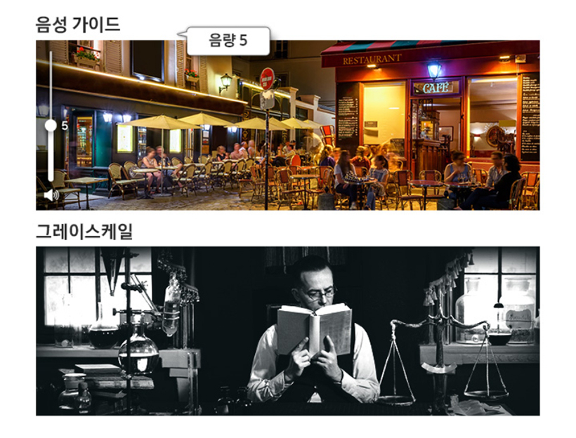 저시력 사용자도 편리하게 스마트 모니터를 사용할 수 있도록 설계하였습니다. 화면 확대는 물론, 색상 전환, 볼륨 및 채널 화면, 오디오 설정 시 모든 사용자가 쉽게 보고 사용할 수 있는 도구가 탑재되어 있습니다.