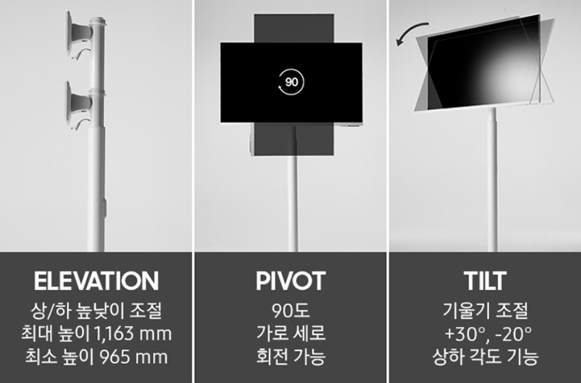 강력한 장력과 고정력을 통해 90도 PIVOT이 지원되도록 설계하여 원하는 방향으로 다양하게 조정할 수 있고, 내가 원하는 환경에 맞게 배치하여 사용할 수 있습니다.