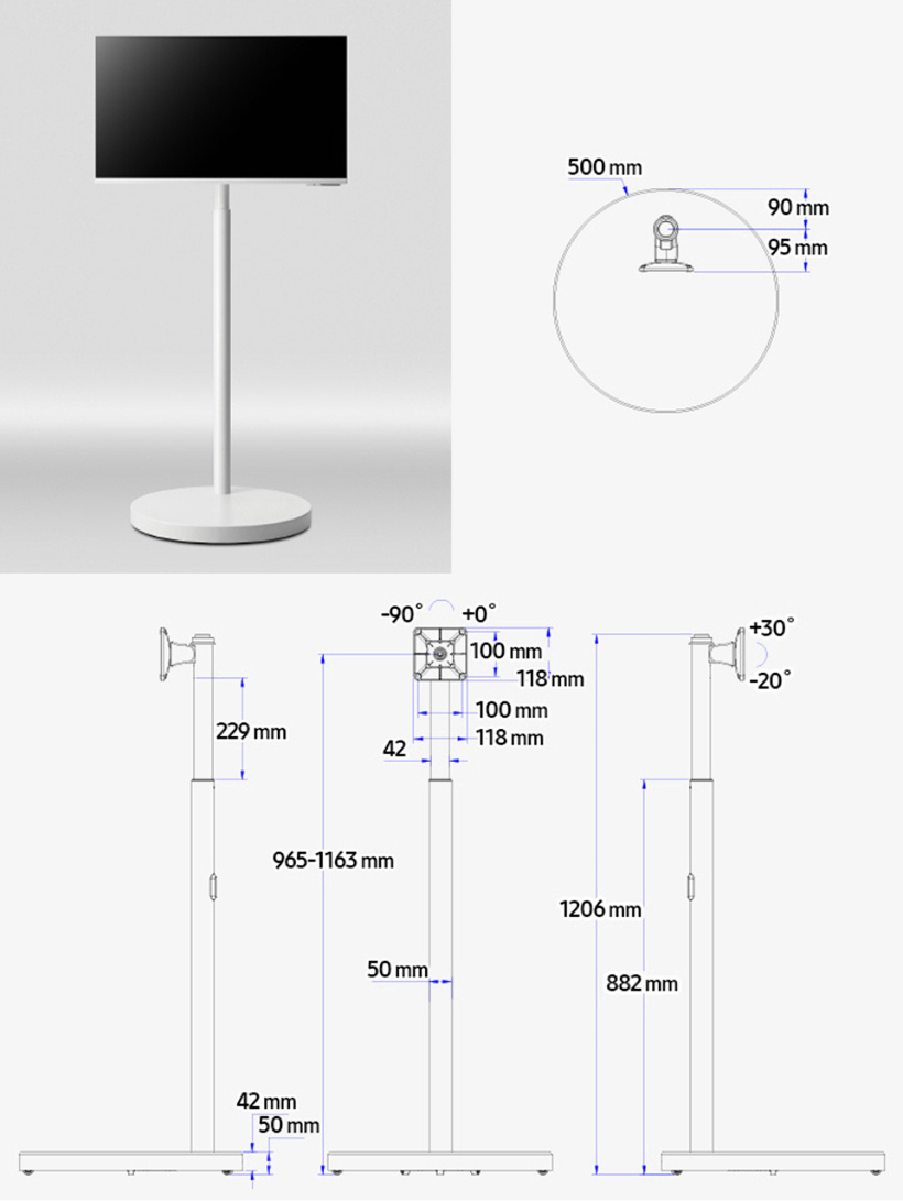- 고정부(틸트)에서 바닥판 총 높이 965 ~ 1,163 mm