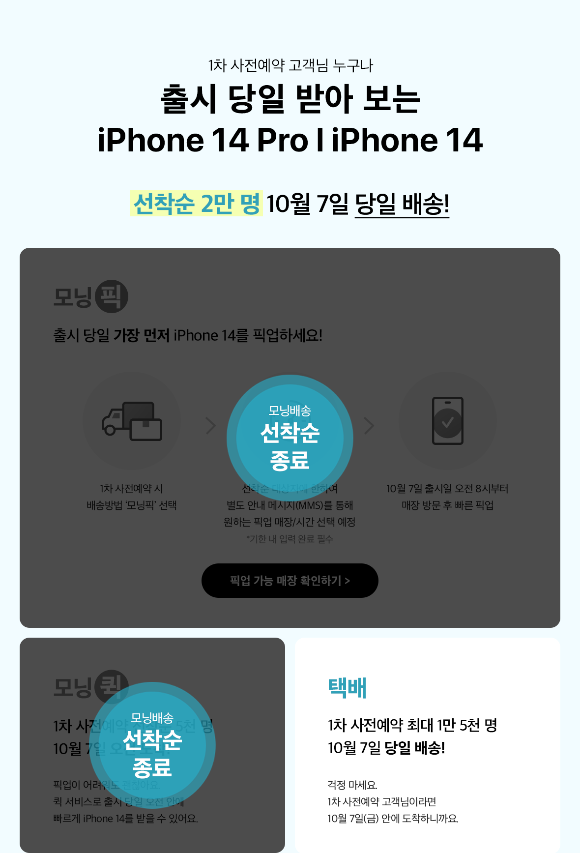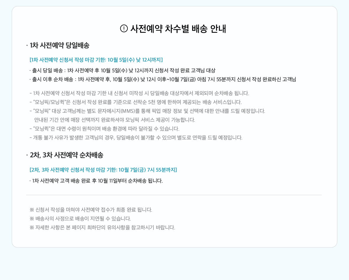 [택배] 1차 사전예약 최대 1만 5천 명 10월 7일 당일 배송! 걱정마세요. 1차 사전예약 고객님이라면 10월7일(금) 안에 도착하니까요.