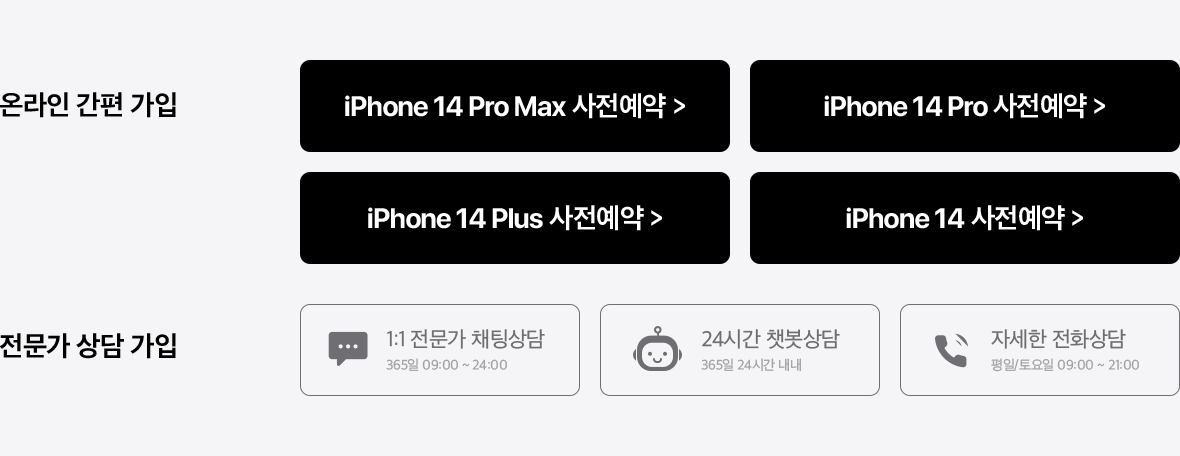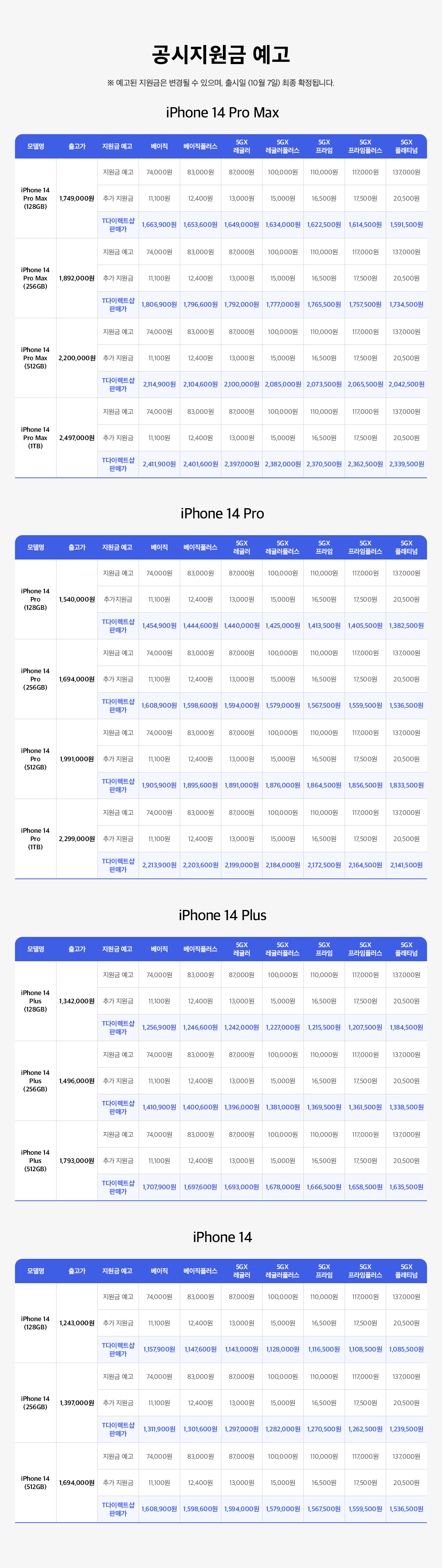 | IPHONE 14 PRO 1TB | 2,299,000원 | 지원금 예고 | 74,000원 | 83,000원 | 87,000원 | 100,000원 | 110,000원 | 117,000원 | 137,000원 |