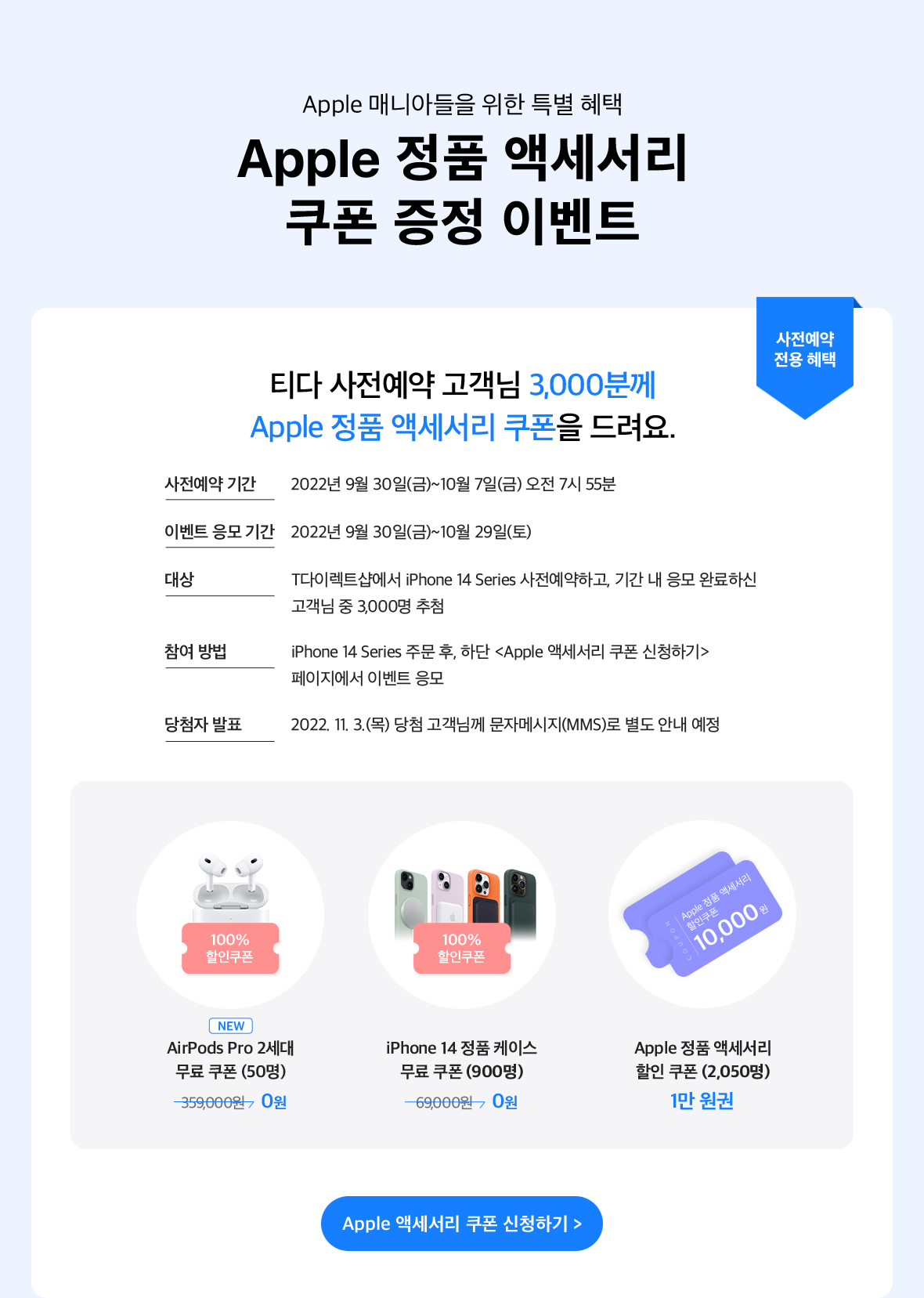 티다 사전예약 고객님 3,000분께 Apple 정품 액세서리 쿠폰을 드려요.