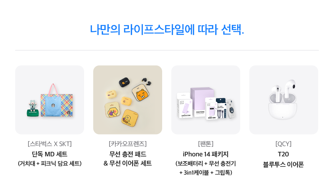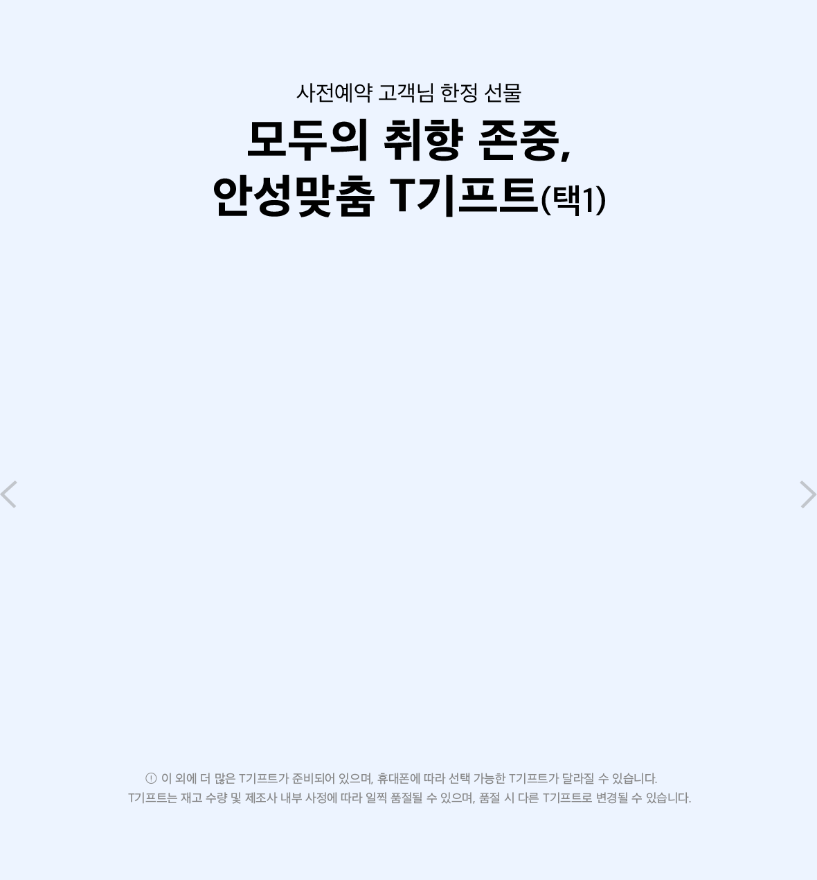 이 외에 더 많은 T기프트가 준비되어 있으며, 휴대폰에 따라 선택 가능한 T기프트가 달라질 수 있습니다. T기프트는 재고 수량 및 제조사 내부 사정에 따라 일찍 품절될 수 있으며, 품절 시 다른 T기프트로 변경될 수 있습니다.