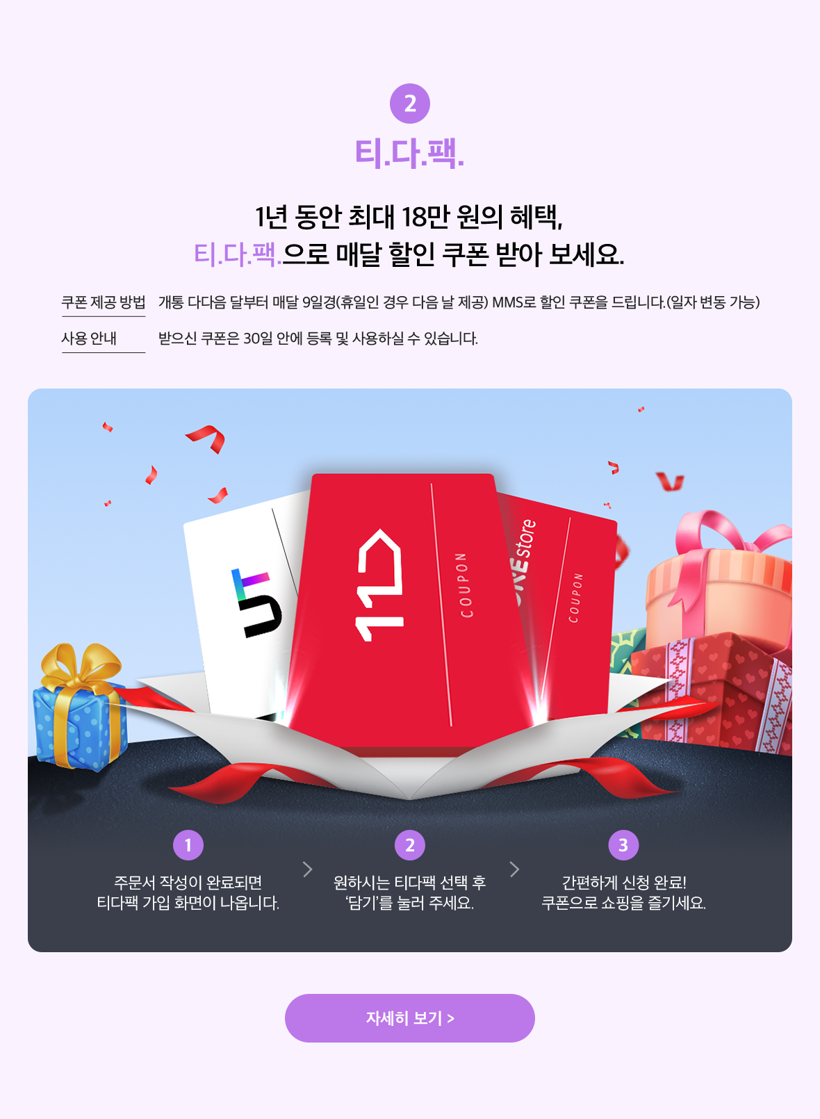 1년 동안 최대 18만 원의 혜택, 티.다.팩.으로 매달 할인 쿠폰 받아 보세요.