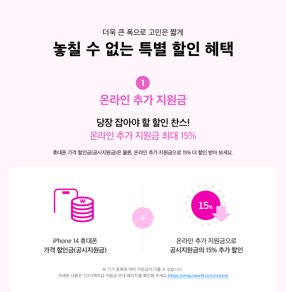 휴대폰 가격 할인금(공시지원금)은 물론, 온라인 추가 지원금으로 15% 더 할인 받아 보세요.