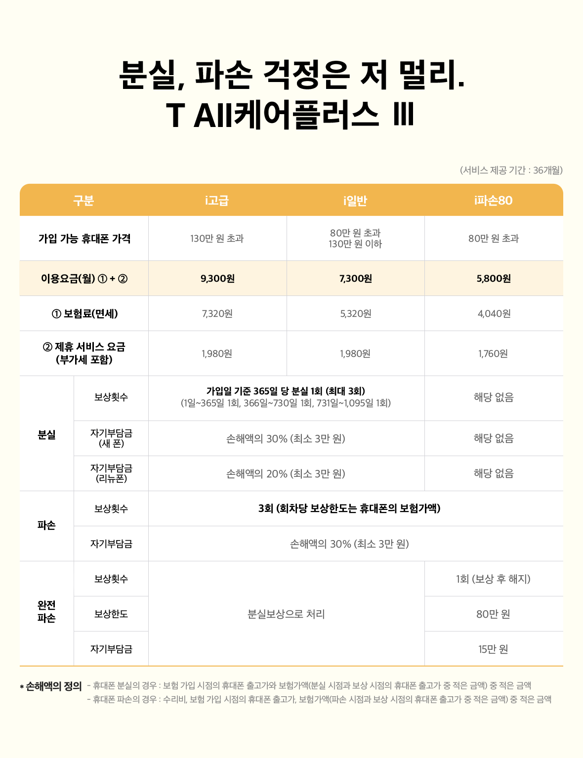 | 파손 | 보상횟수 | 3회(회차당 보상한도는 휴대폰의 보험가액) | ||